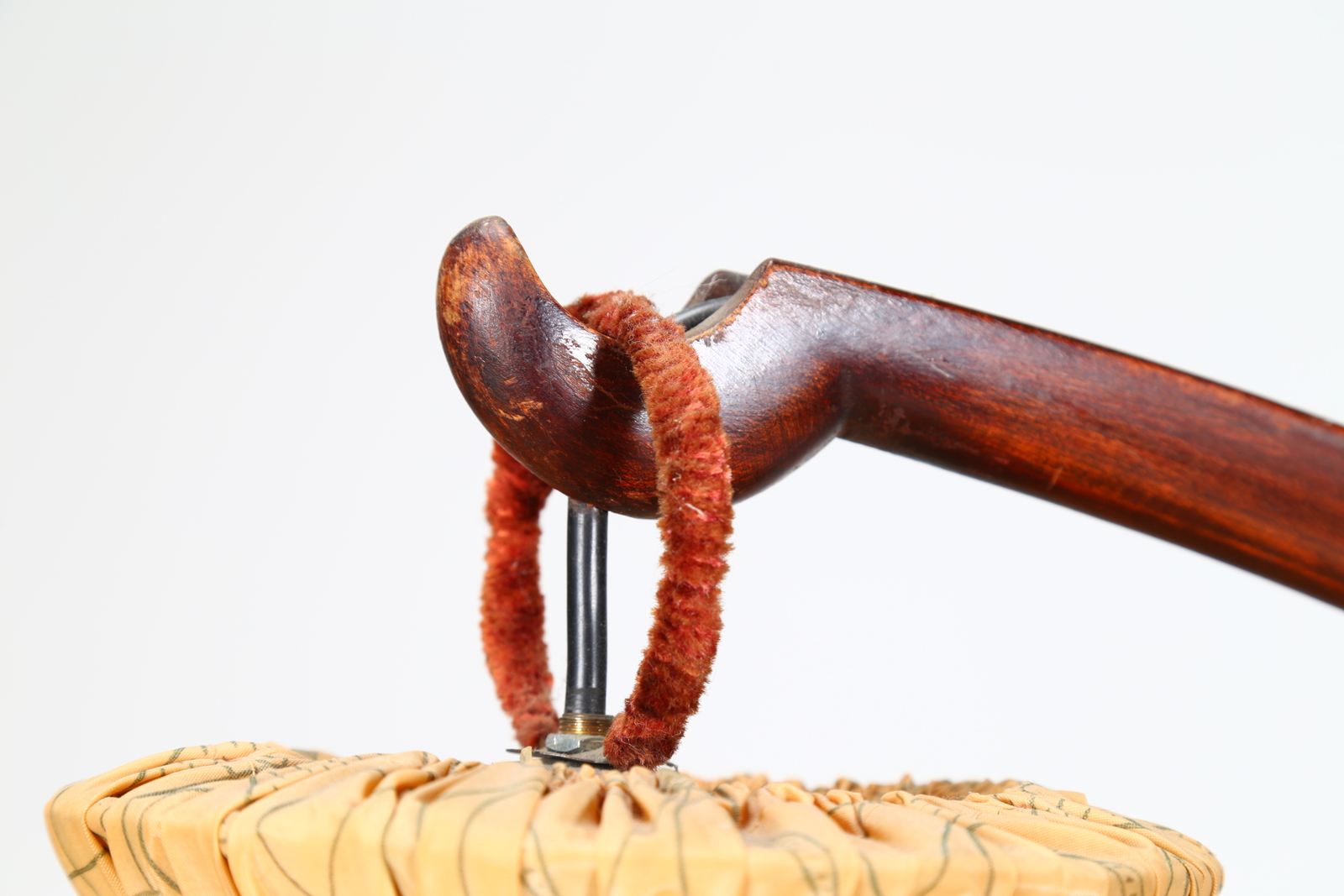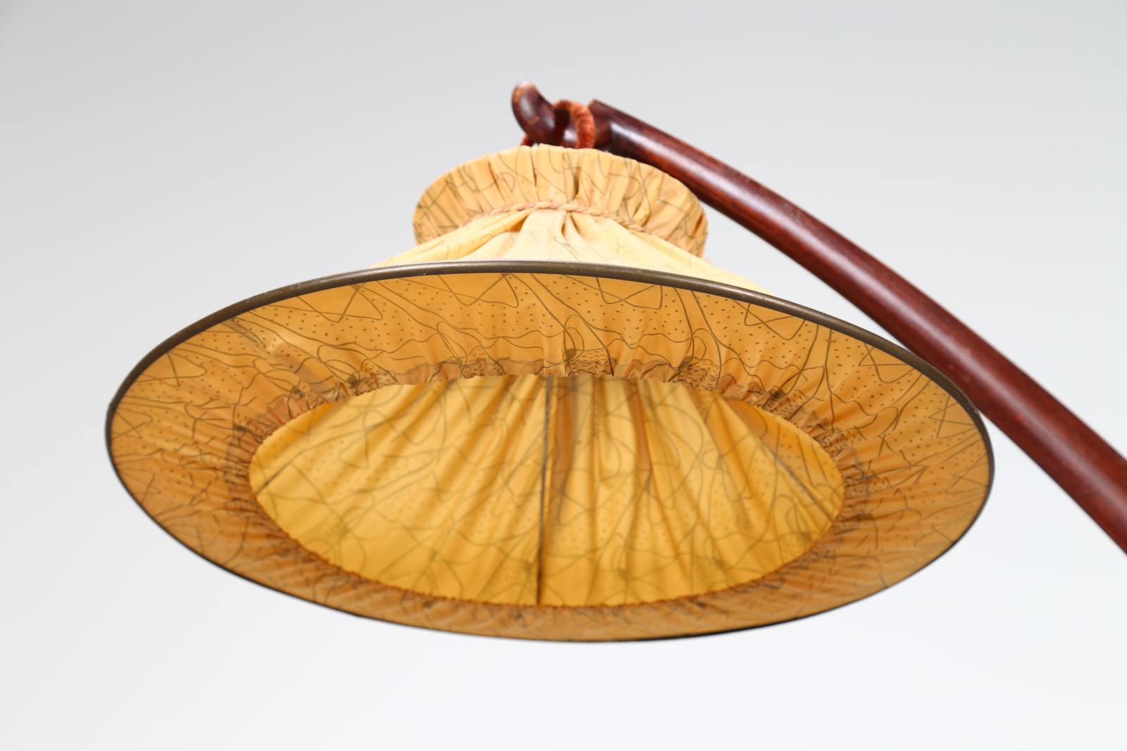 MANIFATTURA ITALIANA Lampada da terra. Tessuto, legno e ottone. Cm 140,00 x 170,00 x 59,00. Tessuto, legno e ottone. Anni 50.