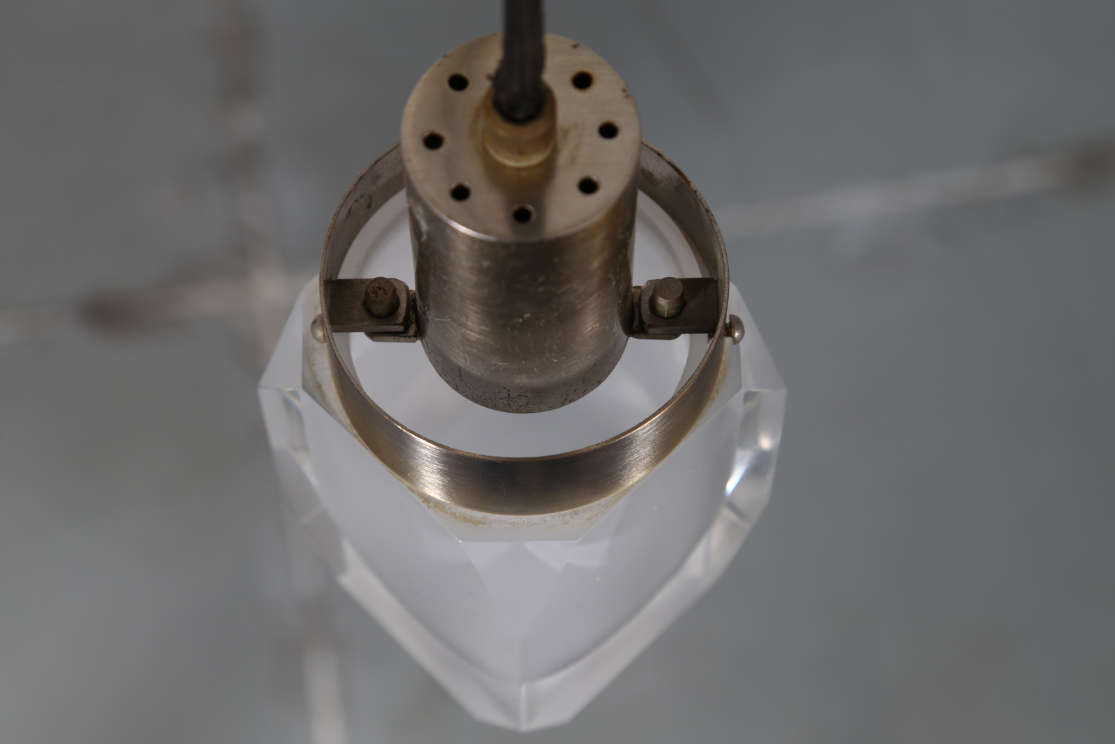 GAETANO MISSAGLIA Lampadario sei luci. Metallo laccato, plexiglass e ottone. Cm 30,00 x 158,00 x 30,00. Metallo laccato, plexiglass e ottone. Anni 70.