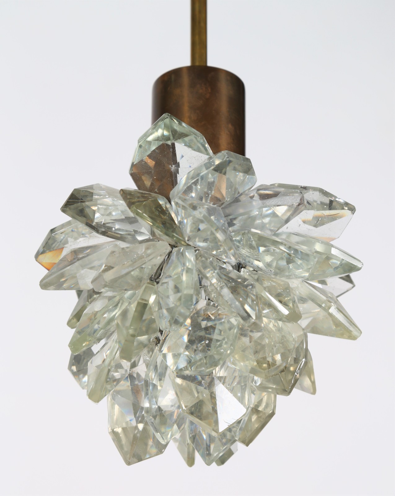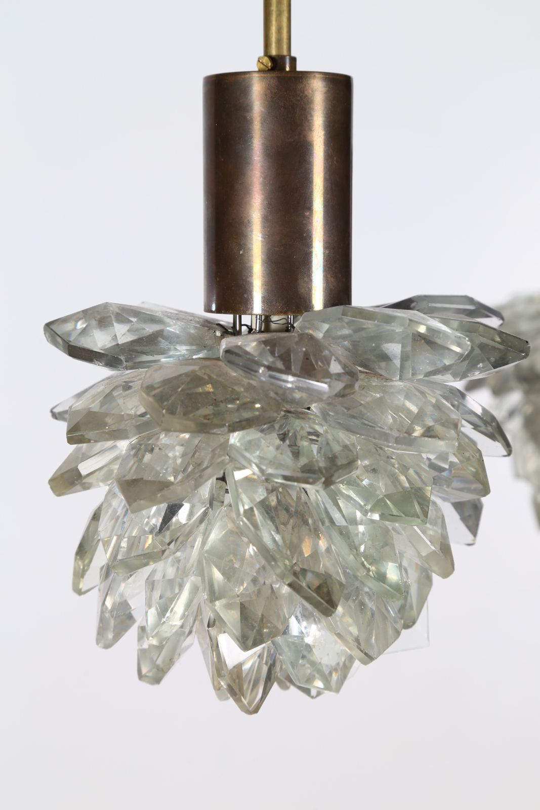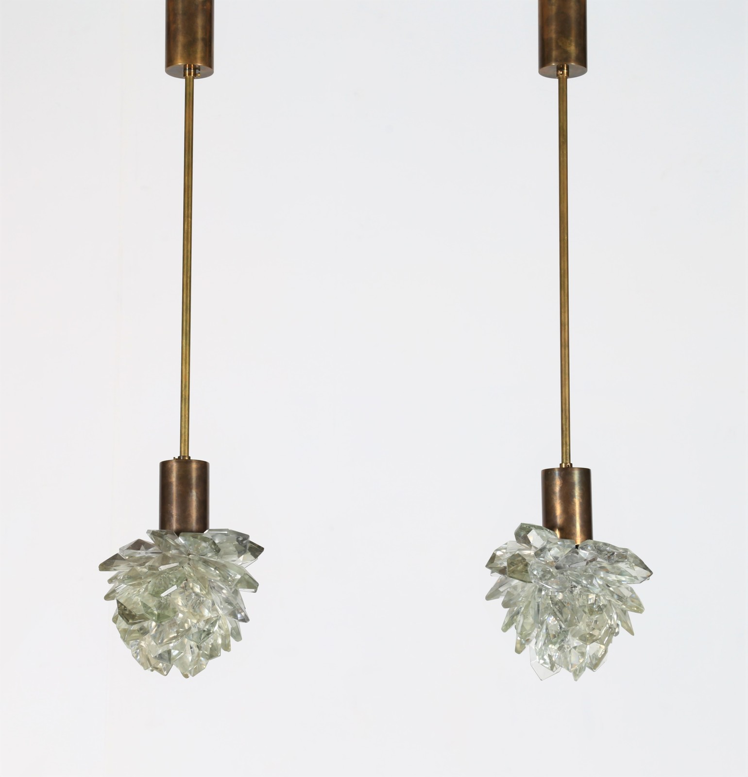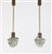 MANIFATTURA ITALIANA Coppia di lampade a sospensione. Ottone e vetro. Cm...