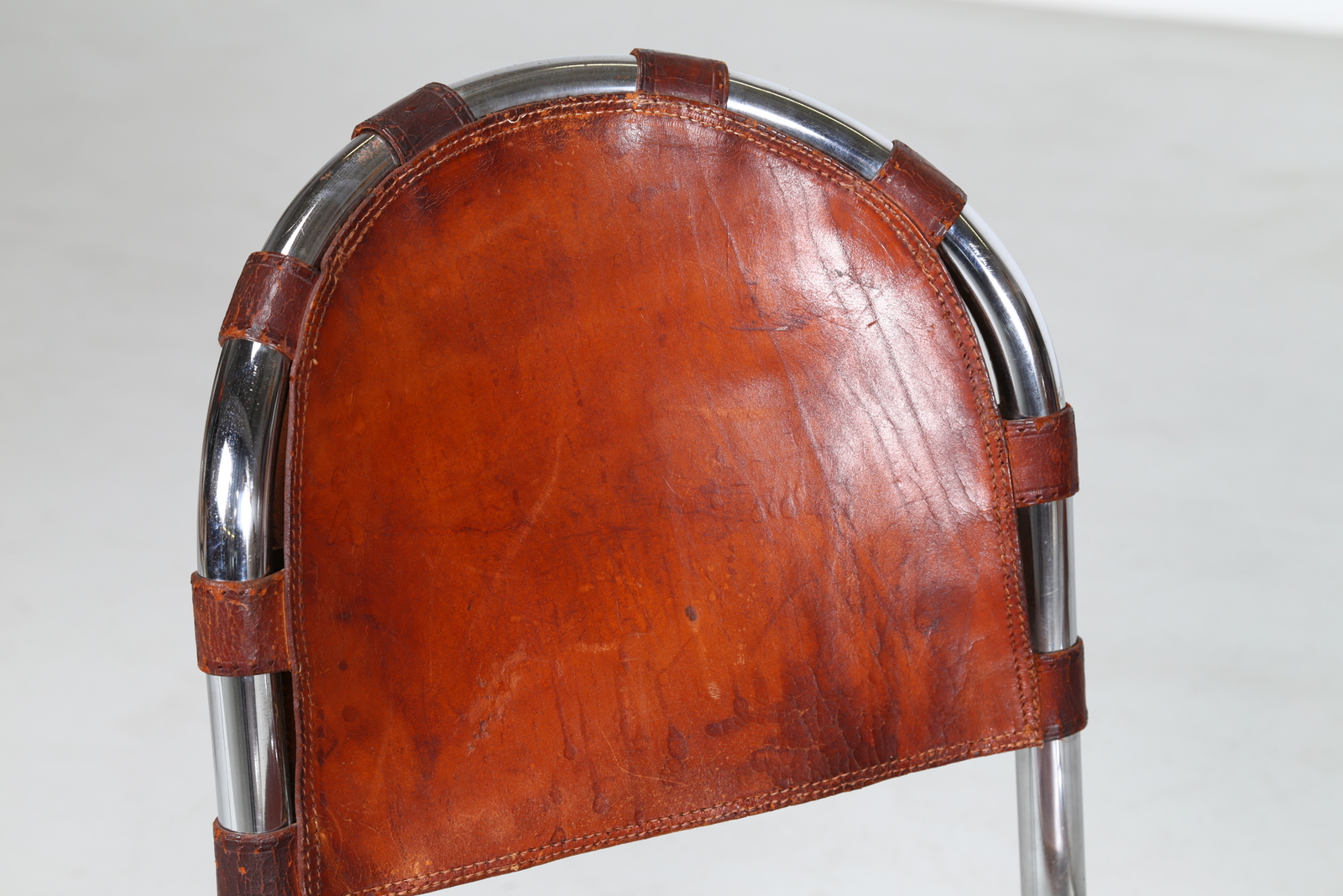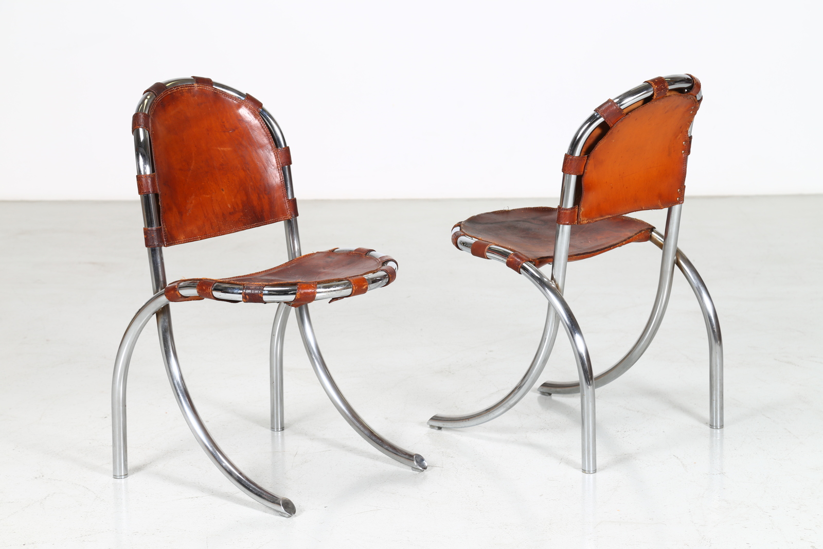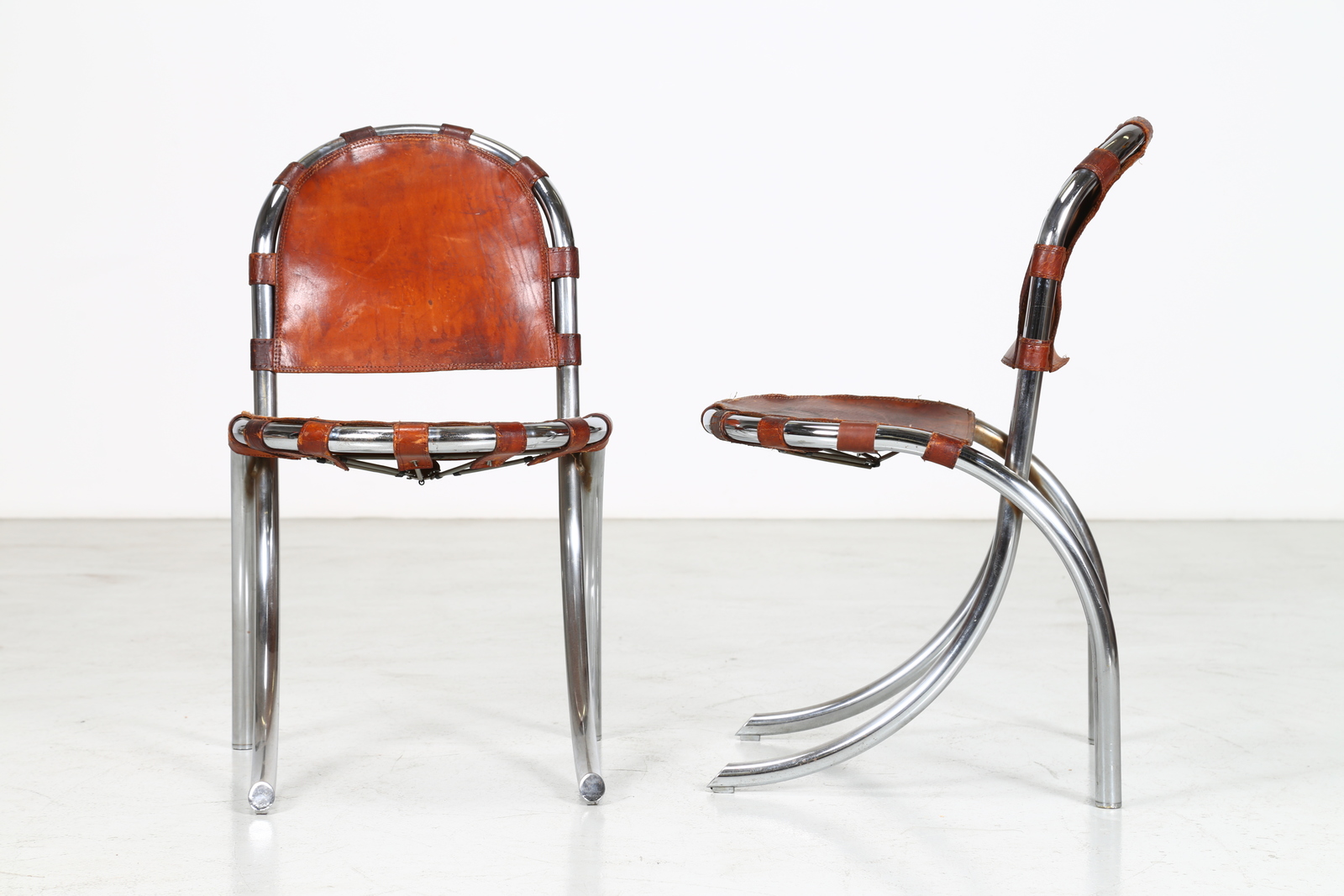 STUDIO TETRARCH Coppia di sedie mod. Medusa. Metallo cromato e cuoio. Cm 47,00 x 80,00 x 54,00. Metallo cromato e cuoio. Design Alberto Bazzani per Studio Tetrarch, 1969.