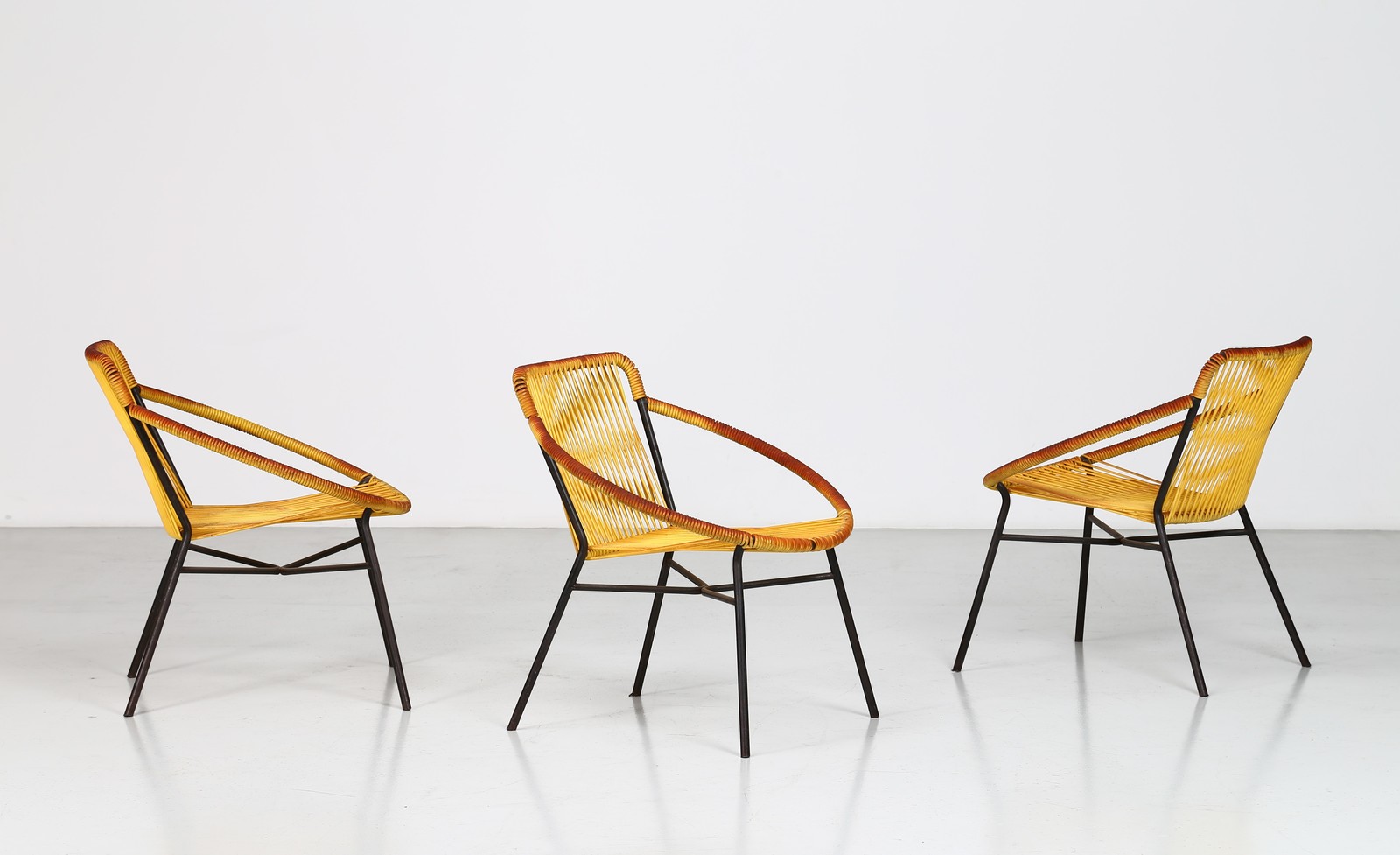 ITALIAN MANUFACTURE Three garden armchairs. Metal and plastic. Cm 69,00 x 73,00 x 66,00. Metal and plastic, 60s.
