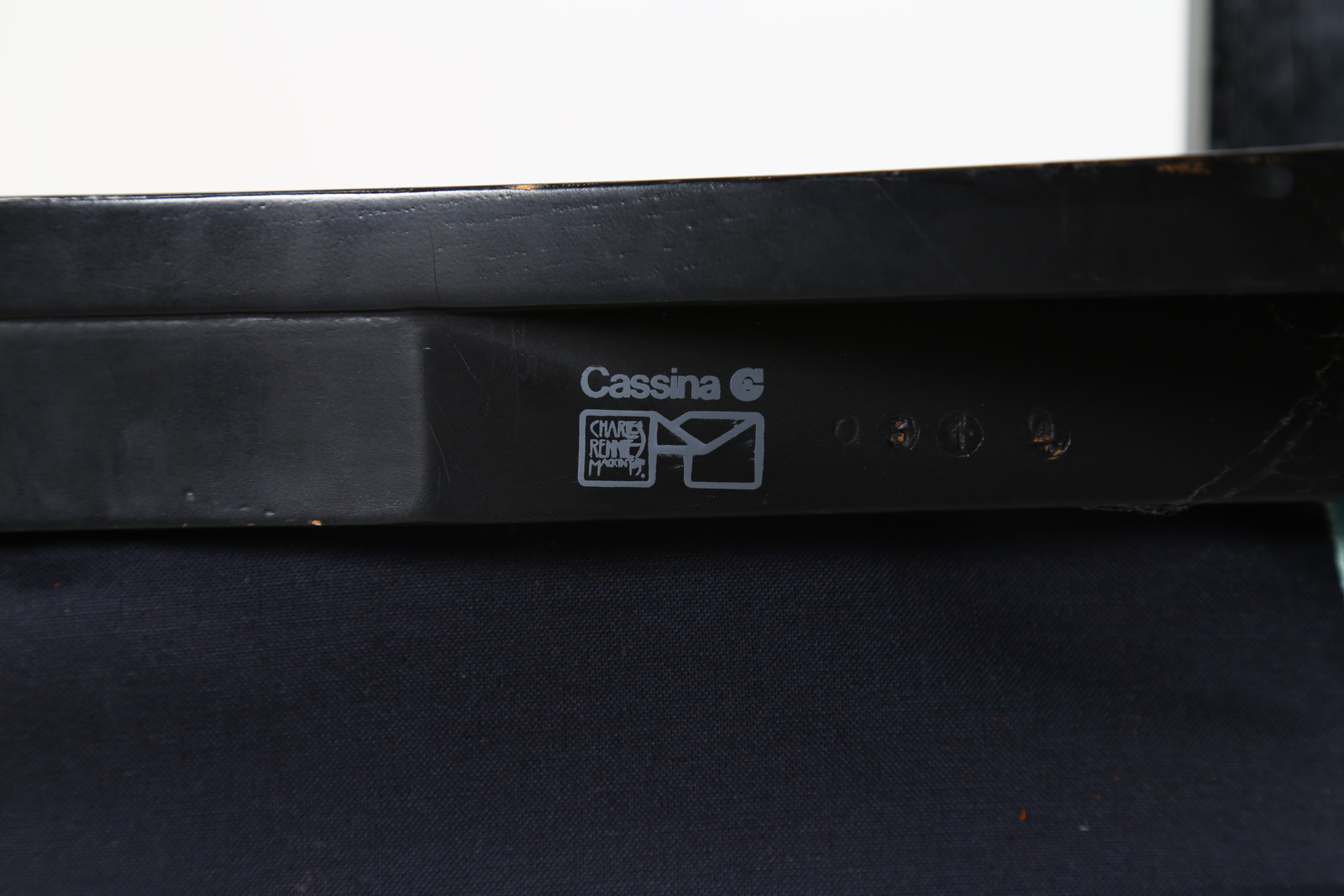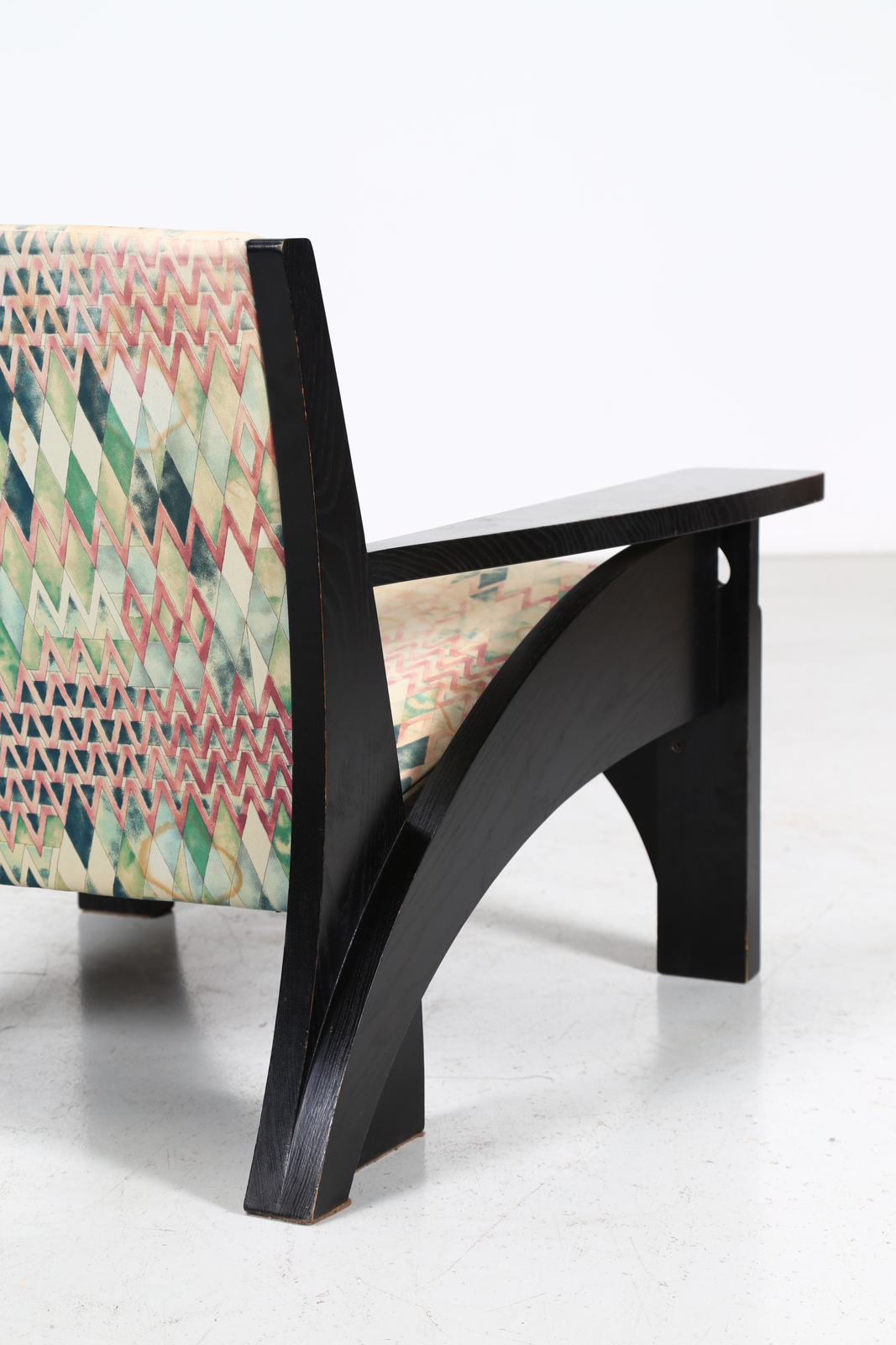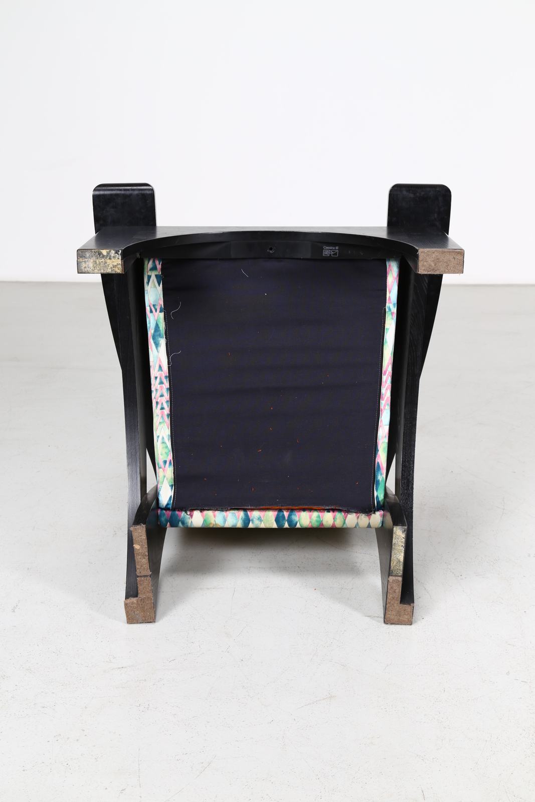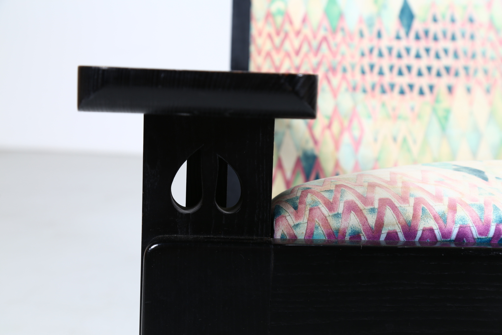 MACKINTOSH CHARLES RENNIE Armchair. Oak and fabric. Cm 77,00 x 68,00 x 74,00. Lacquered oak wood and fabric, for Cassina, 80s.