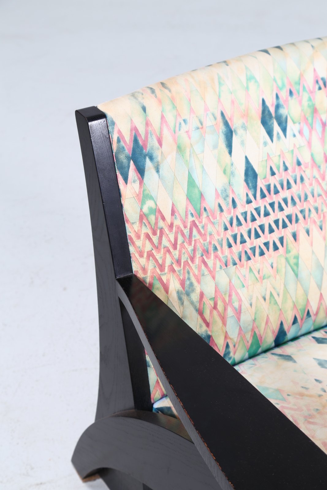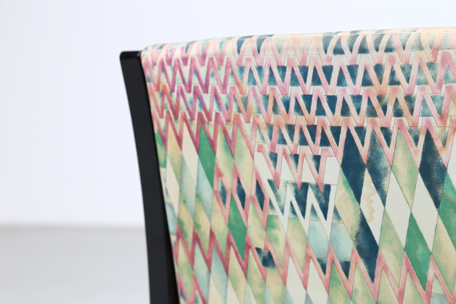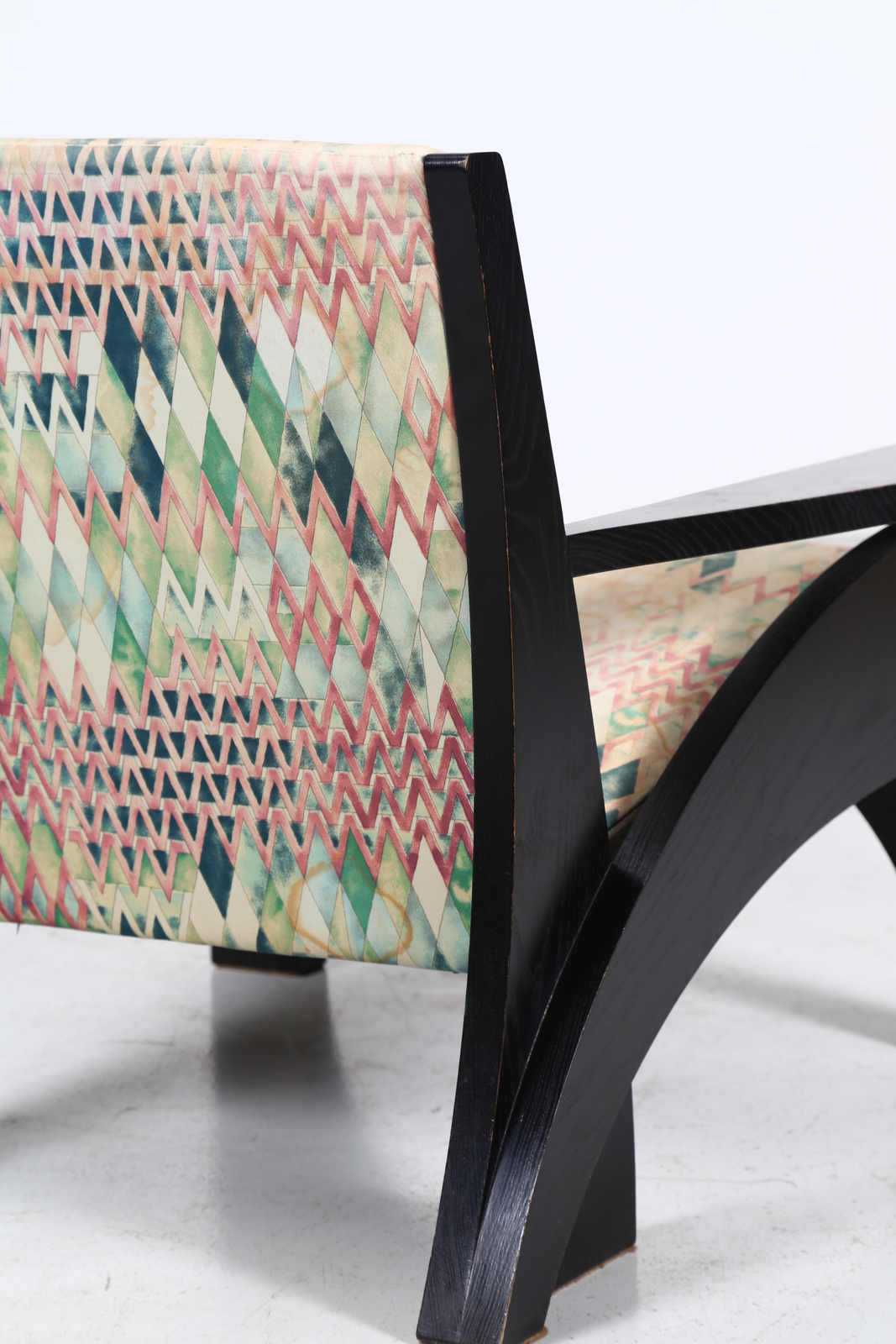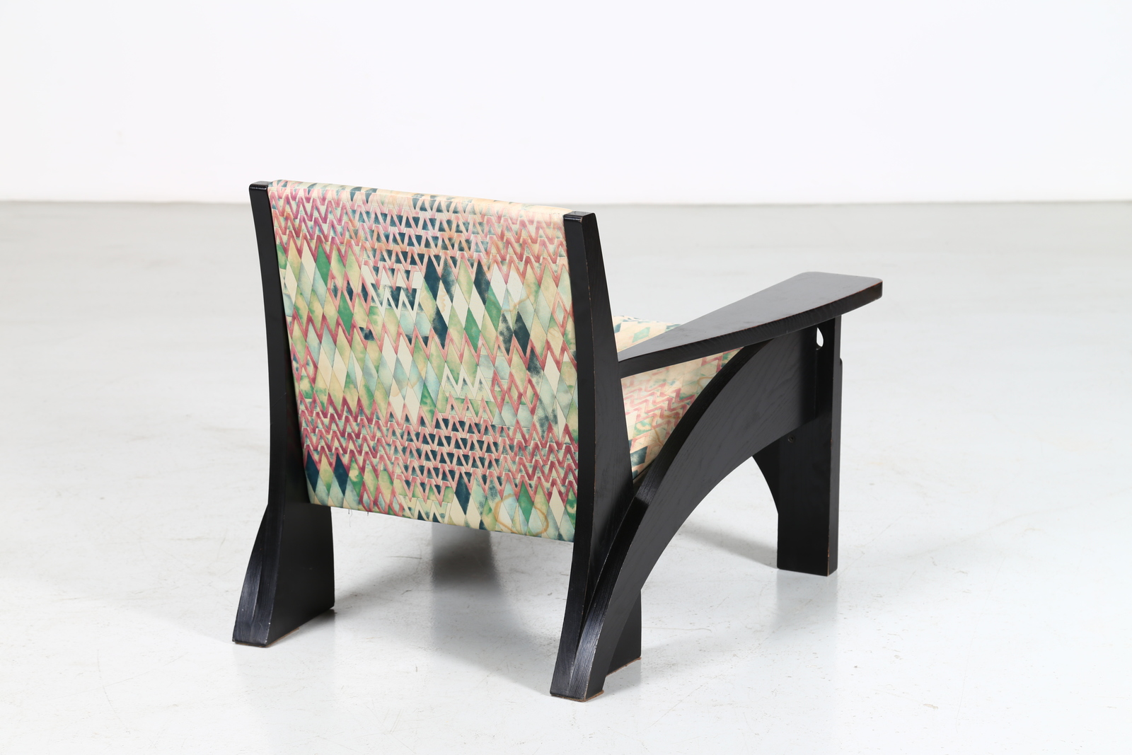 MACKINTOSH CHARLES RENNIE Armchair. Oak and fabric. Cm 77,00 x 68,00 x 74,00. Lacquered oak wood and fabric, for Cassina, 80s.