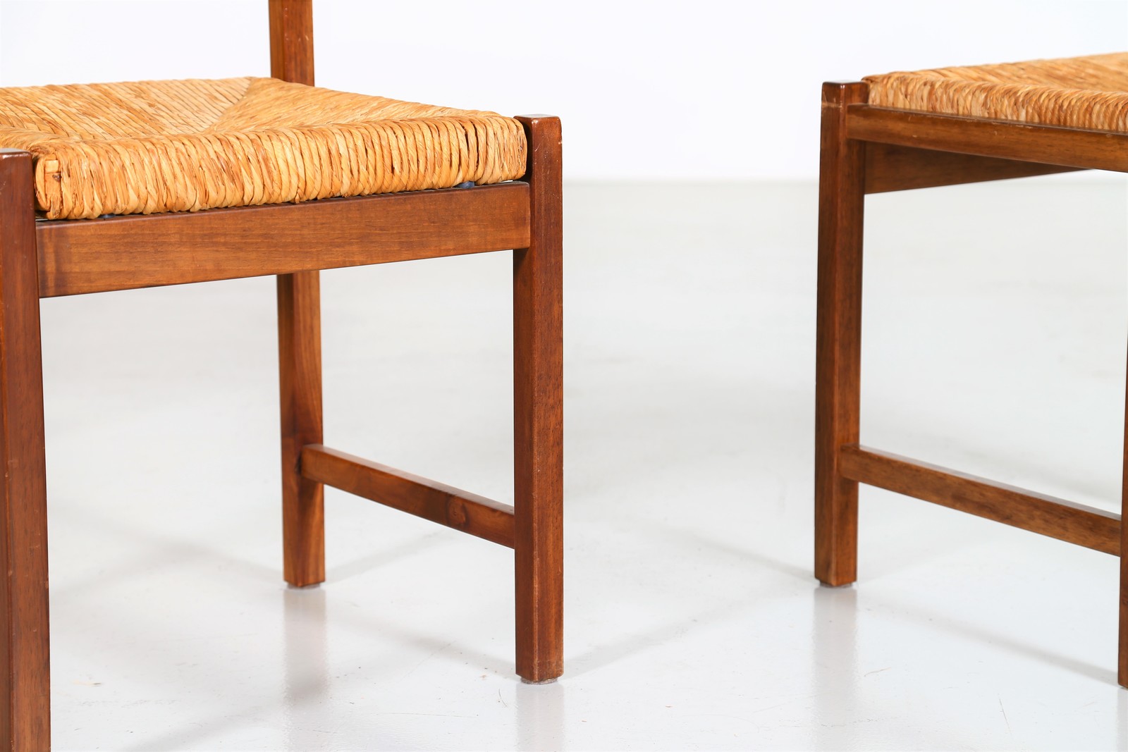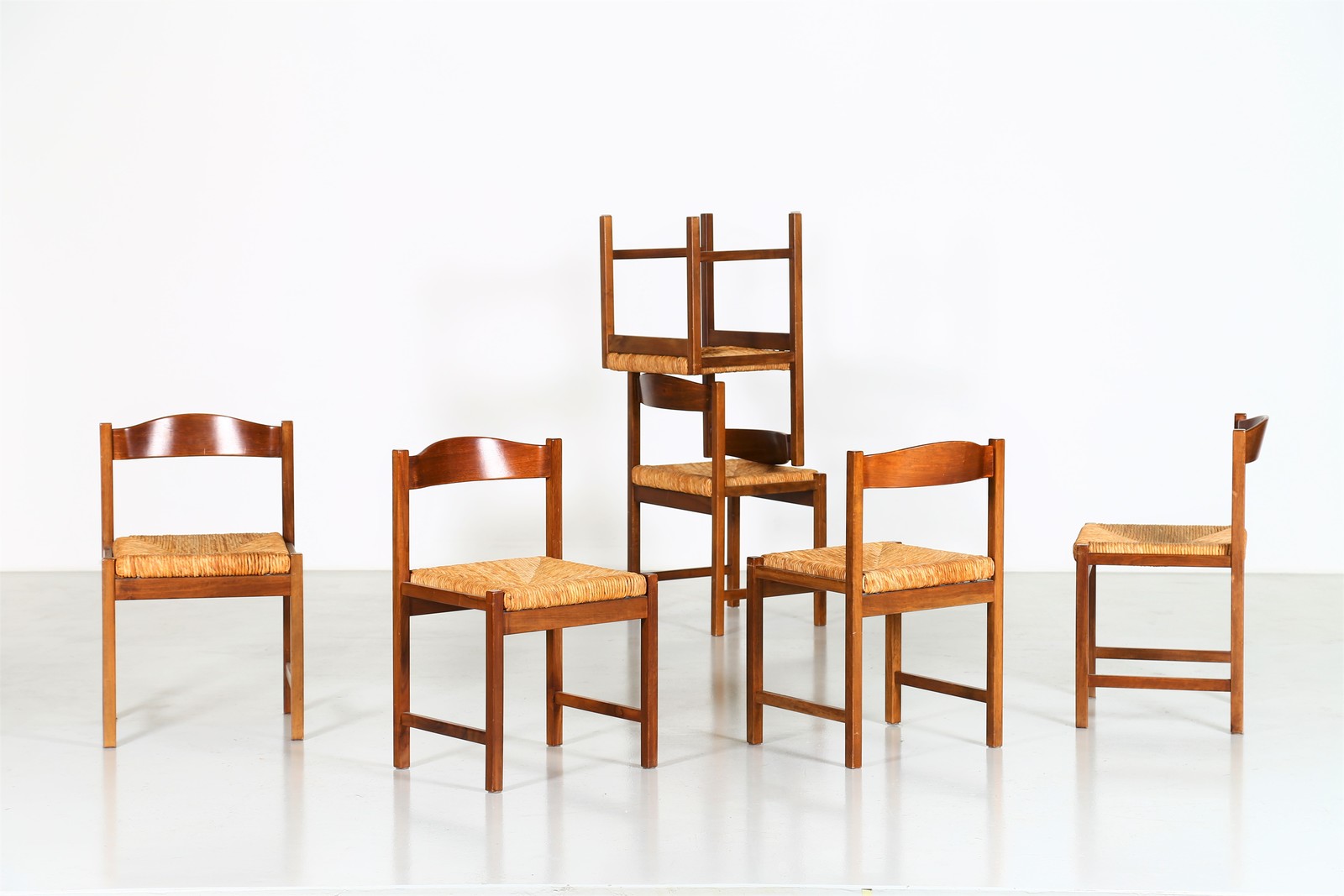 MICHELUCCI GIOVANNI (1891 - 1990) Six chairs. Walnut wood and straw. Cm 45,00 x 73,00 x 44,00. Walnut wood and straw, Torbecchia series for Poltronova, 60s.