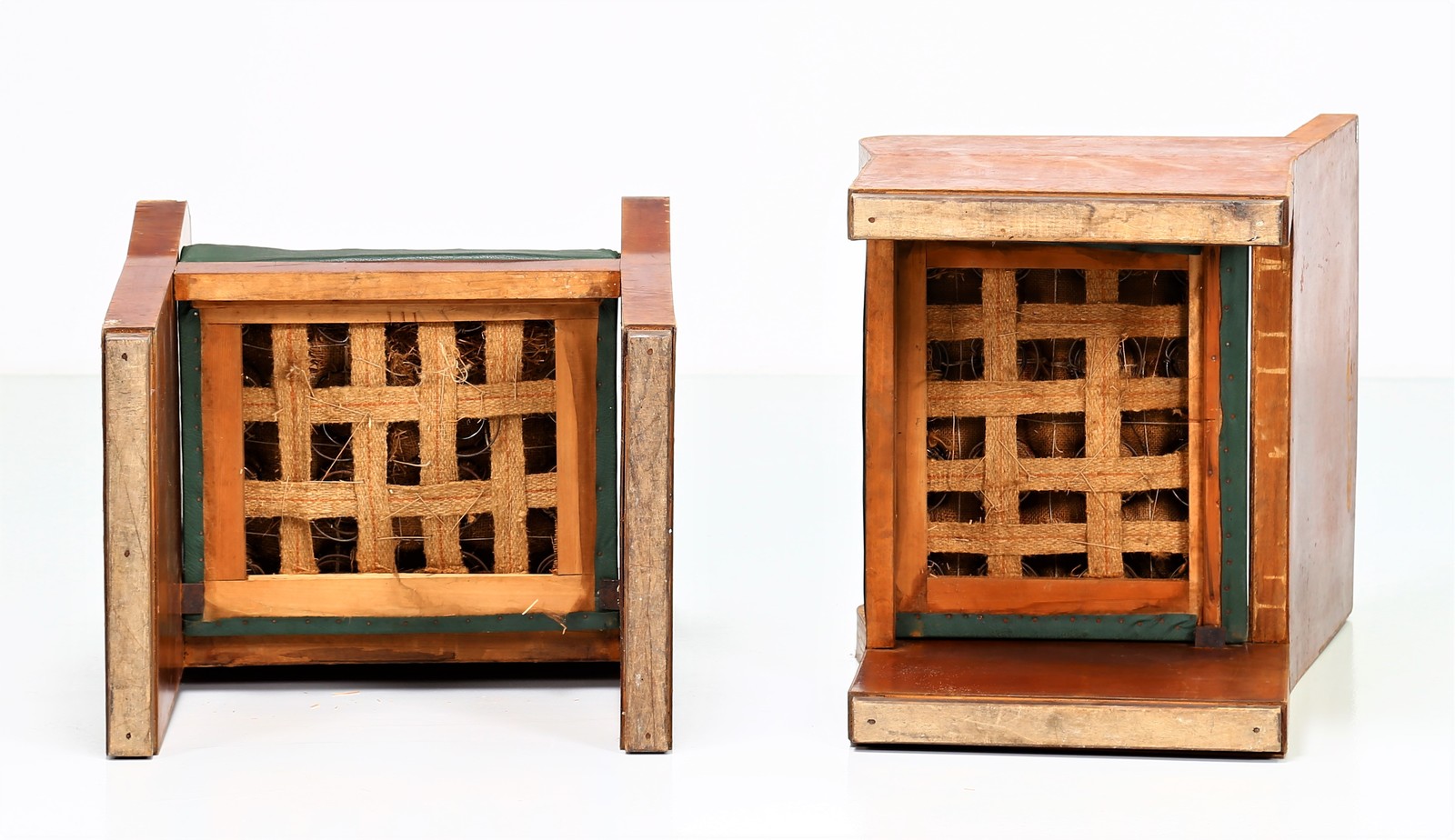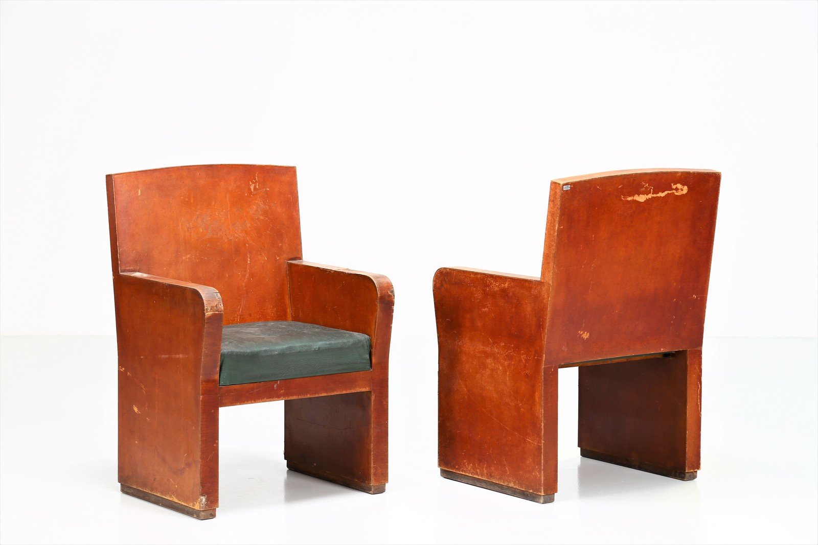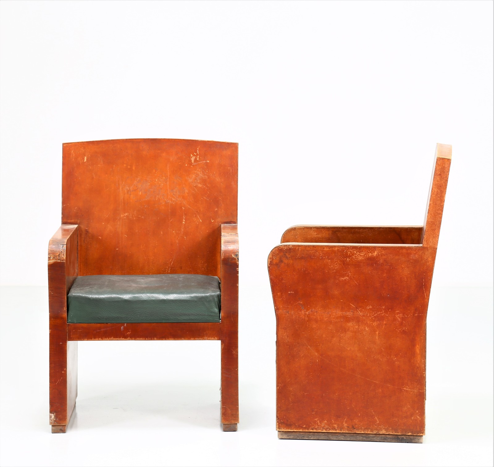 GINO LEVI MONTALCINI & GIUSEPPE PAGANO Pair of chairs. Wood and skai. Cm 64,00 x 96,00 x 60,00. Wood and skai, 30s.