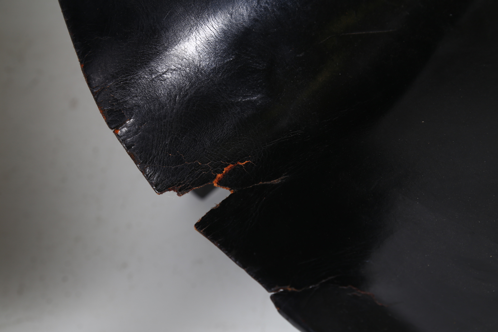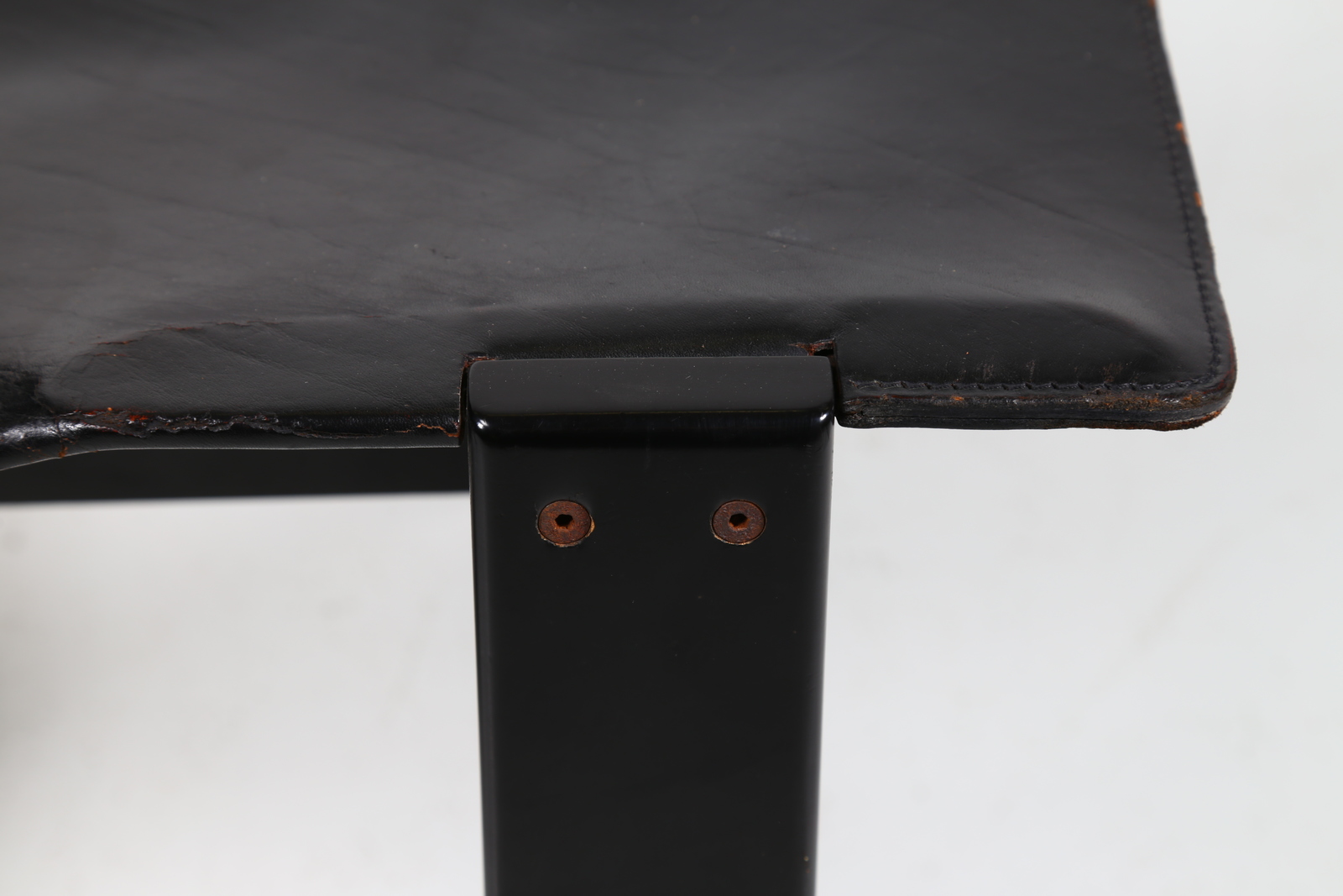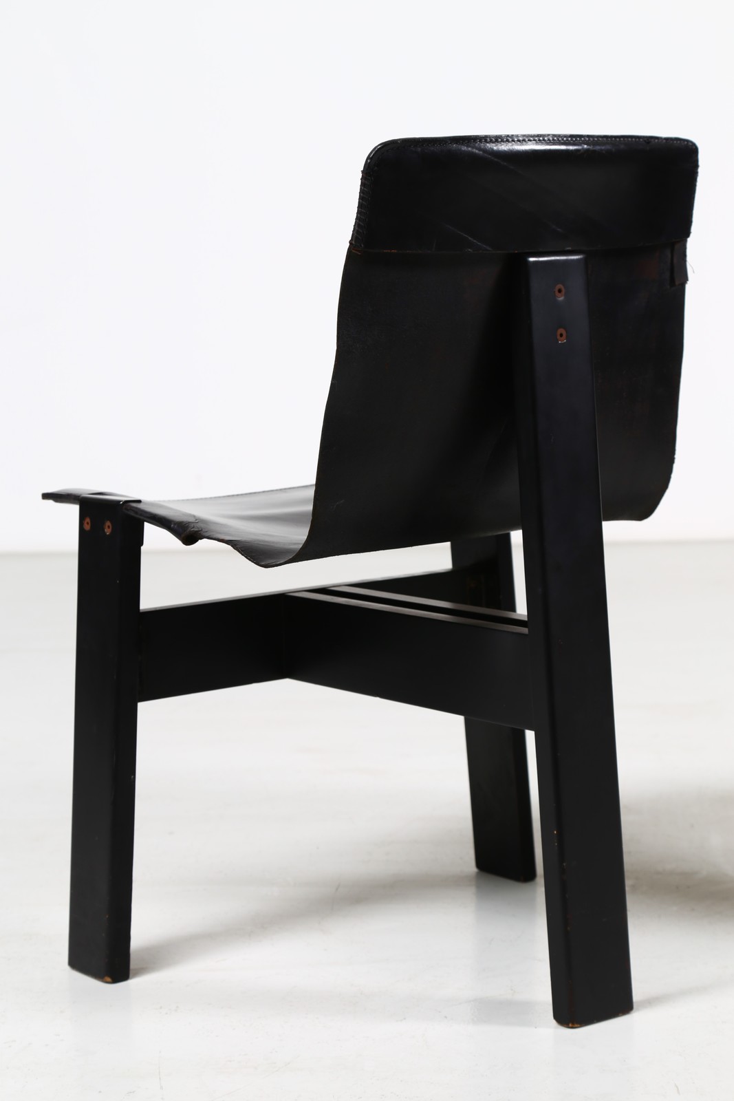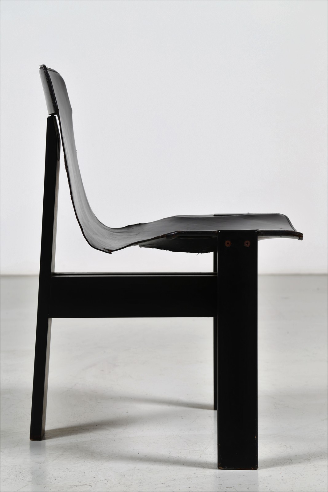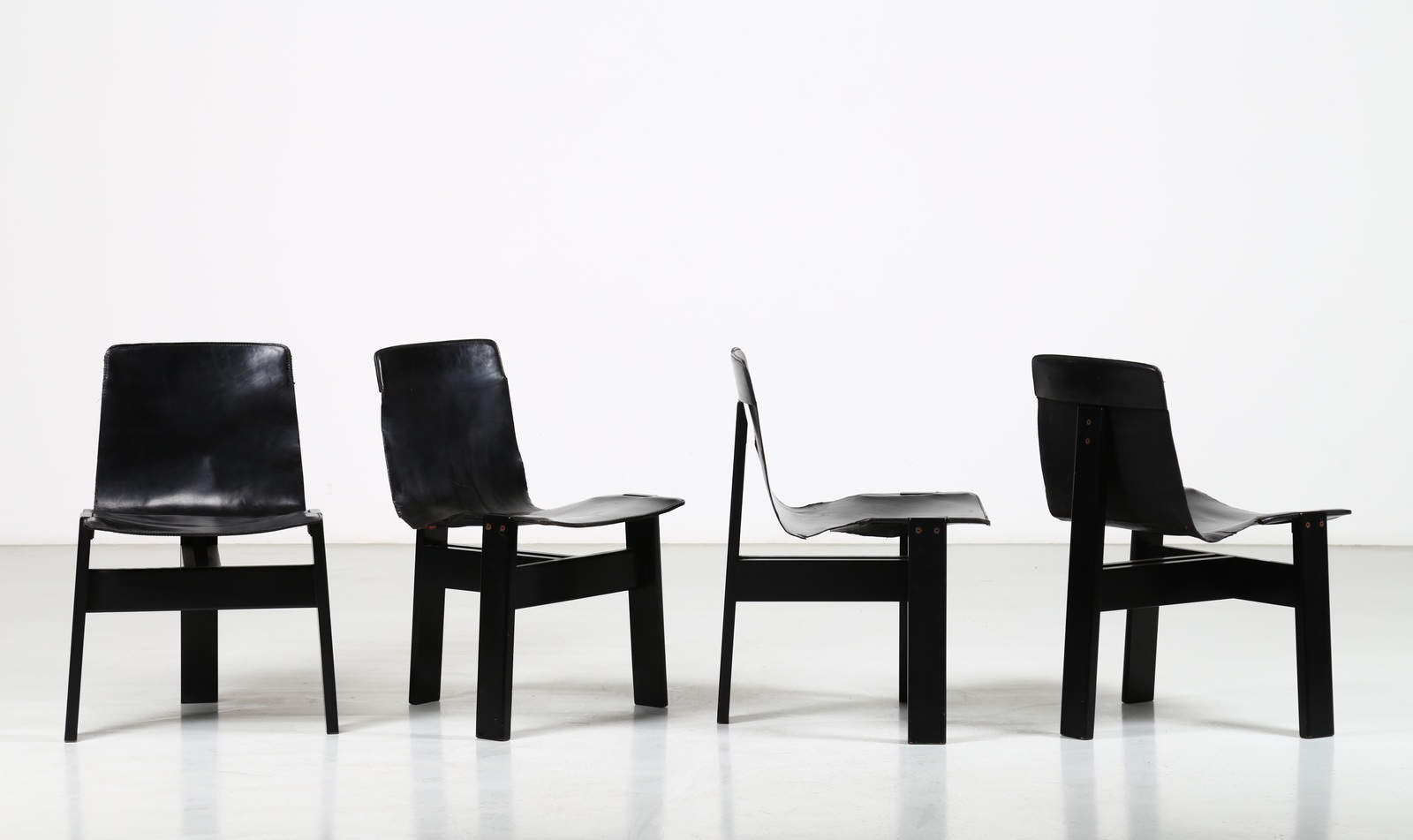 MANGIAROTTI ANGELO (n. 1921) Four chairs mod. Tre3. Lacquered wood and leather. Cm 55,00 x 80,00 x 56,00. Lacquered wood and leather, for Skipper, 1978.