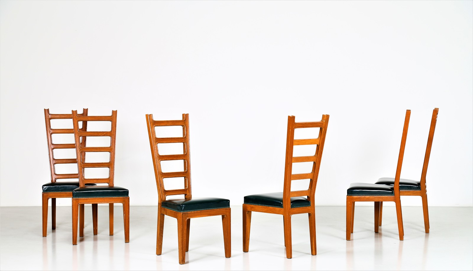 BUFFA PAOLO (1903 - 1970) Six chairs. Wood and skai. Cm 49,50 x 116,00 x 55,00. Oak wood and original skai, 50s.