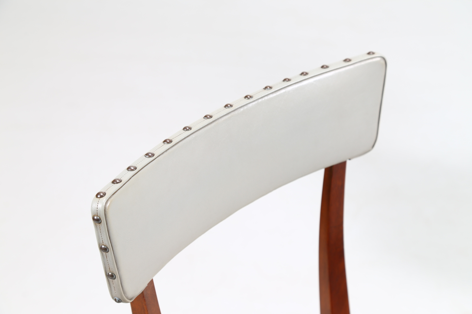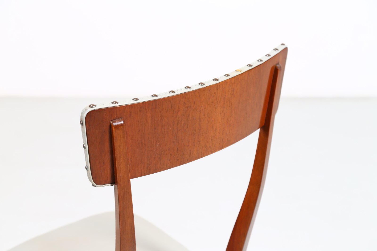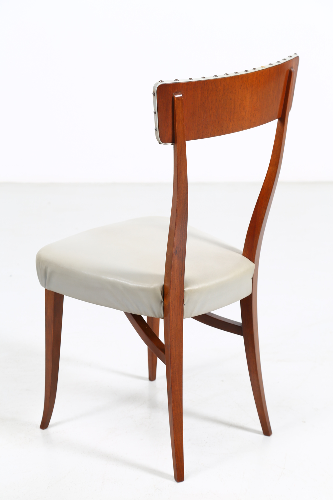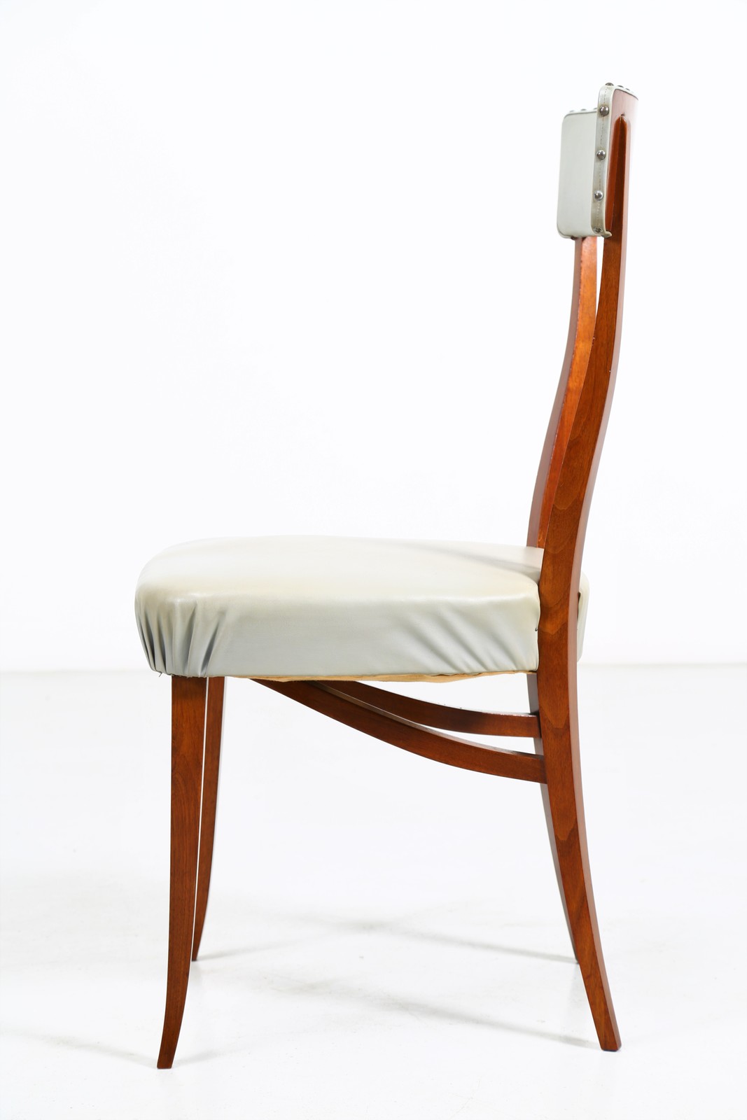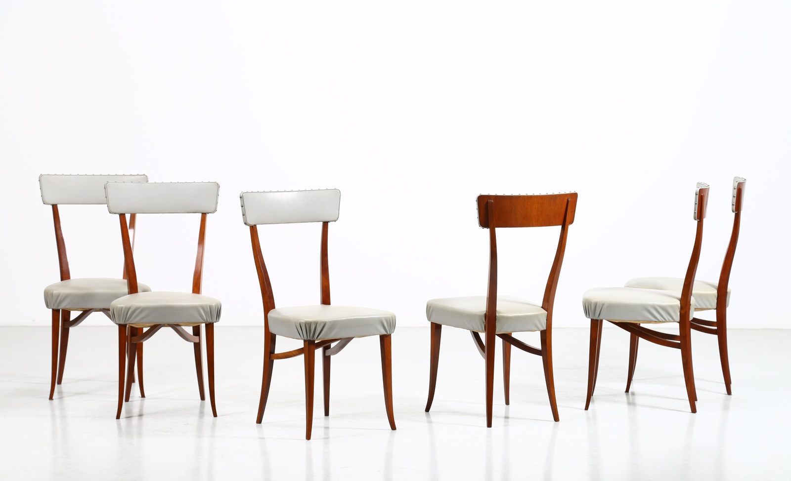 BEGA MELCHIORRE (1898 - 1976) Sei sedie. Legno di noce e skai. Cm 44,00 x 93,00 x 47,00. Legno di noce e skai, anni 50.