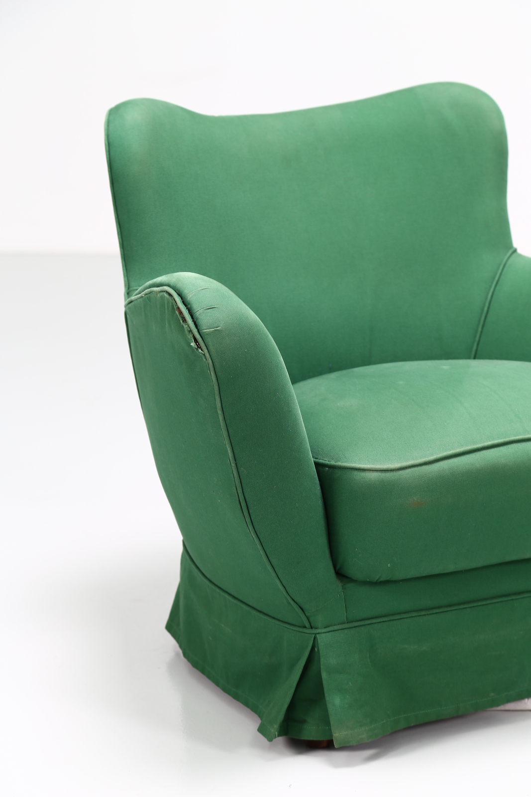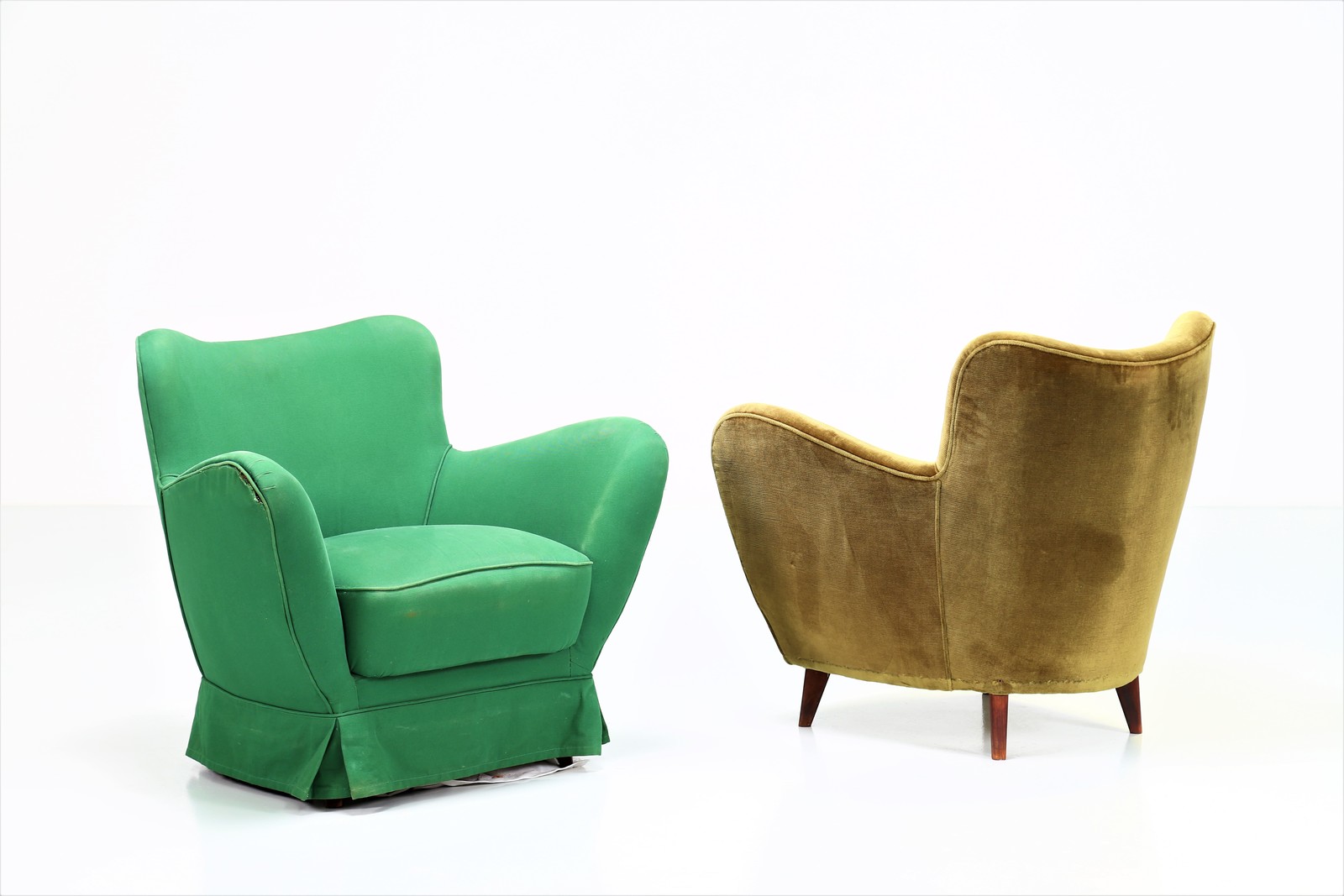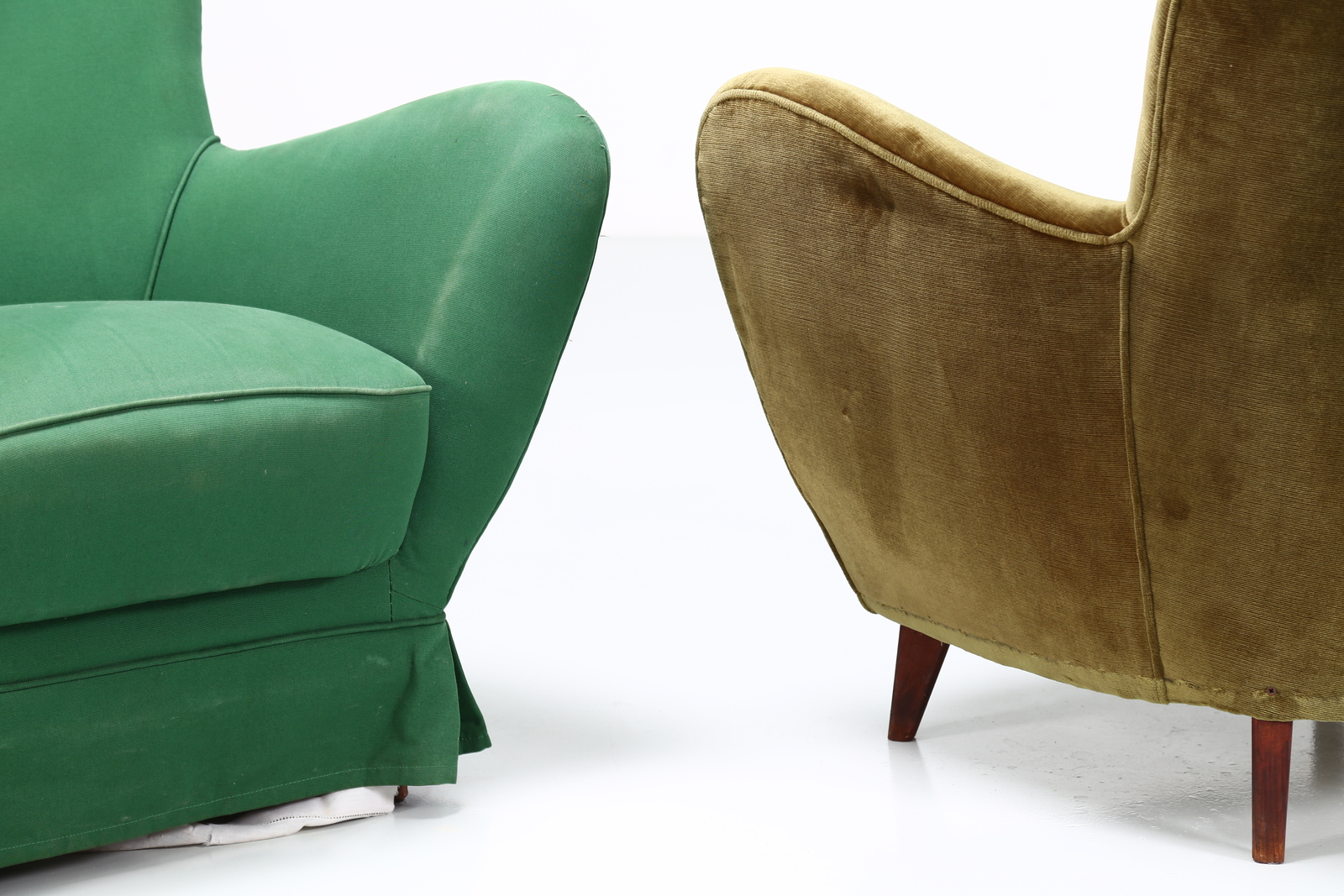 VERONESI GUGLIELMO Pair armchairs. Wood and fabric. Cm 88,00 x 79,00 x 65,00. Wood and fabric, for ISA Bergamo, 50s.