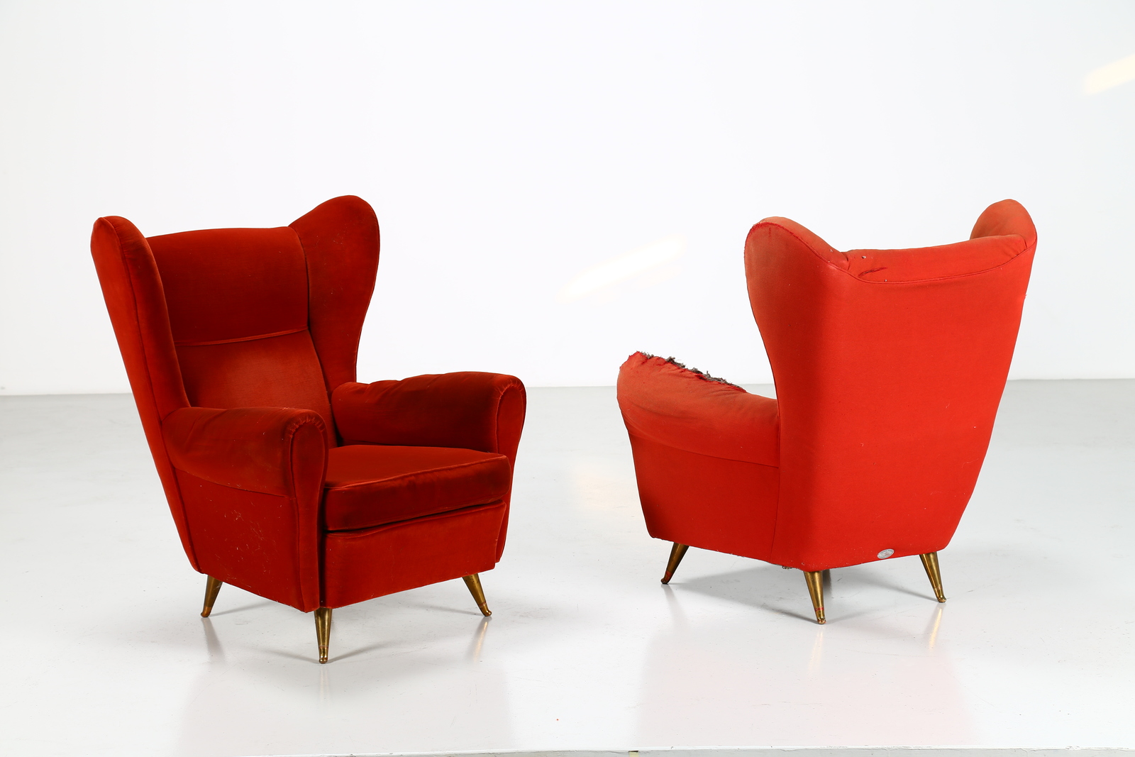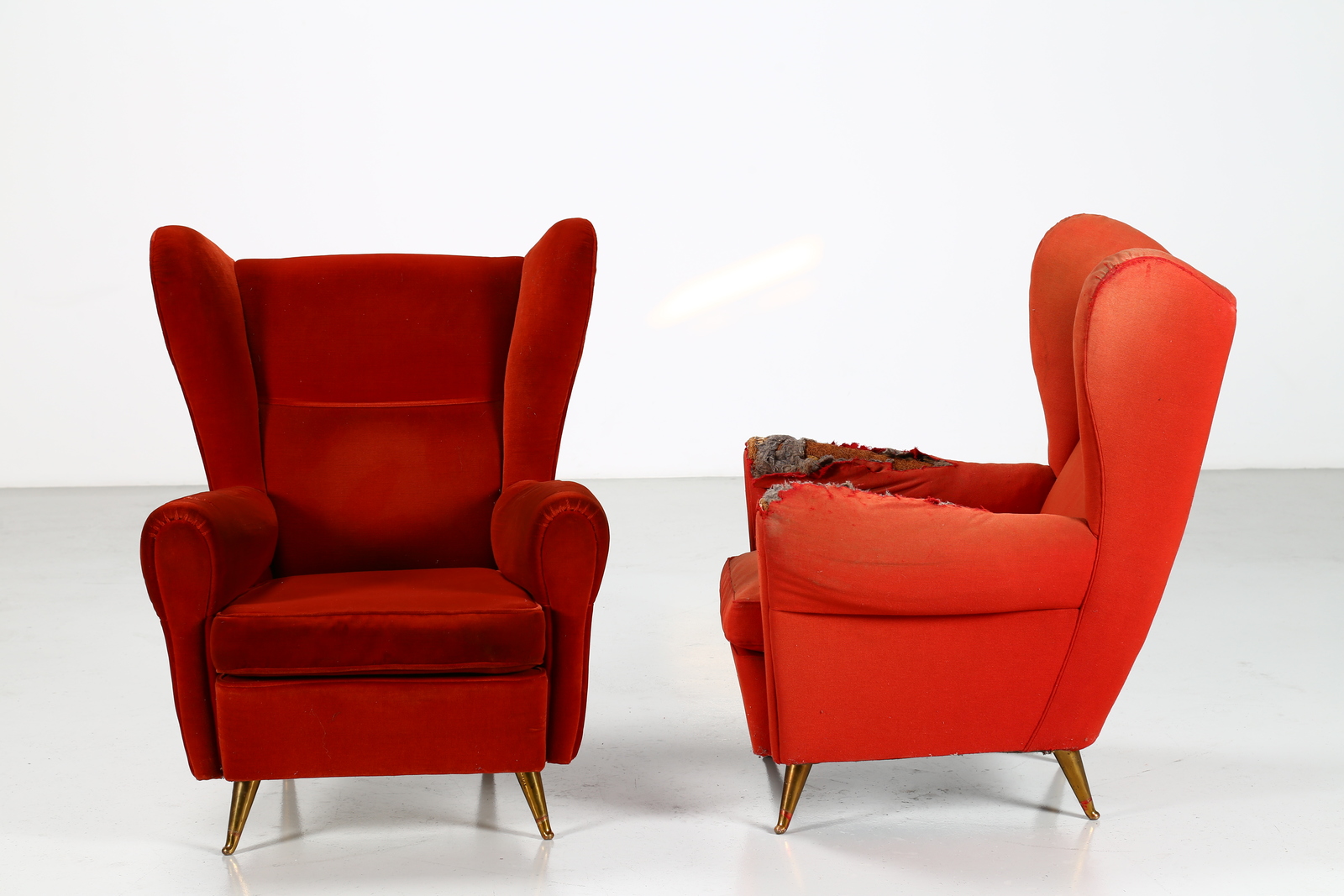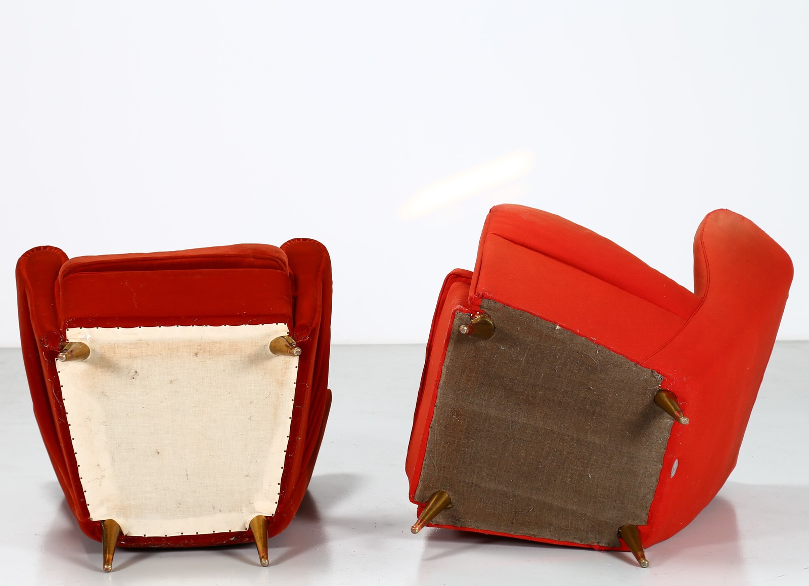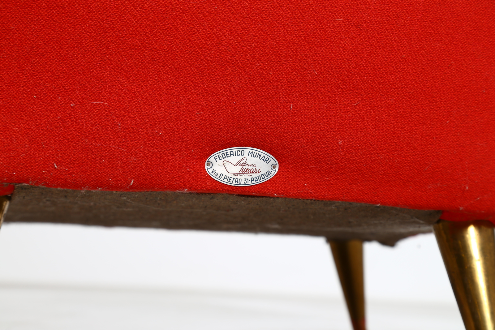 MUNARI FEDERICO Pair of armchairs. Wood, fabric and brass. . Wooden structure, brass feet and original fabric, 1950s. Original label present.