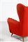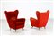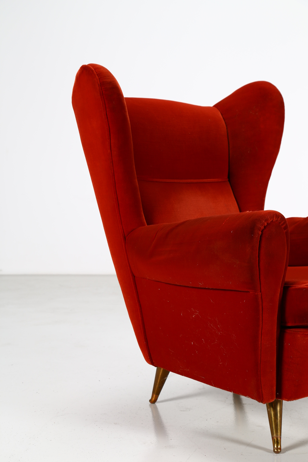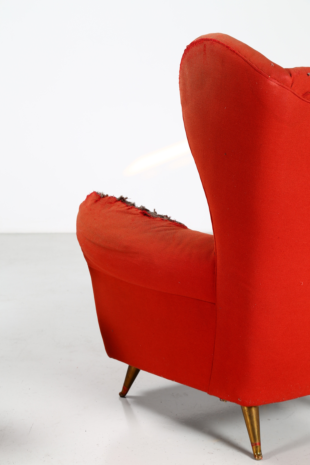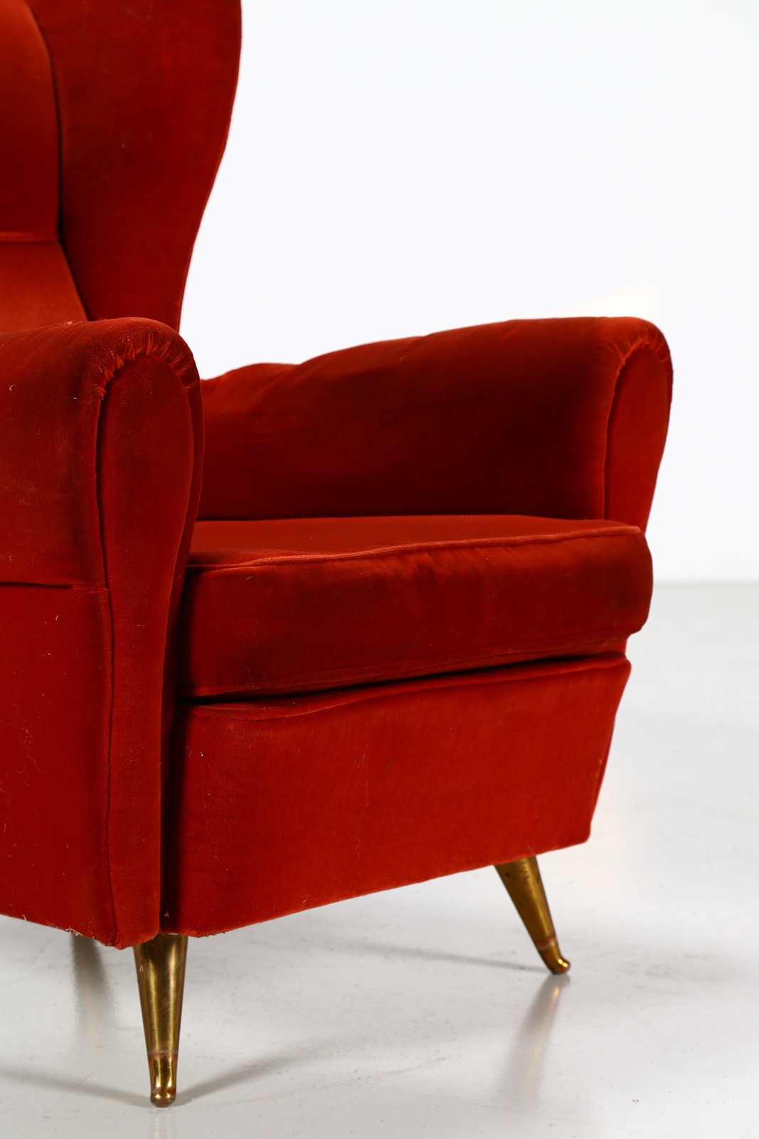 MUNARI FEDERICO Pair of armchairs. Wood, fabric and brass. . Wooden structure, brass feet and original fabric, 1950s. Original label present.