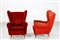 MUNARI FEDERICO Coppia di poltrone. Tessuto, legno e ottone. . Struttura in legno, piedini in ottone e tessuto originale, anni 50. Etichetta originale presente.