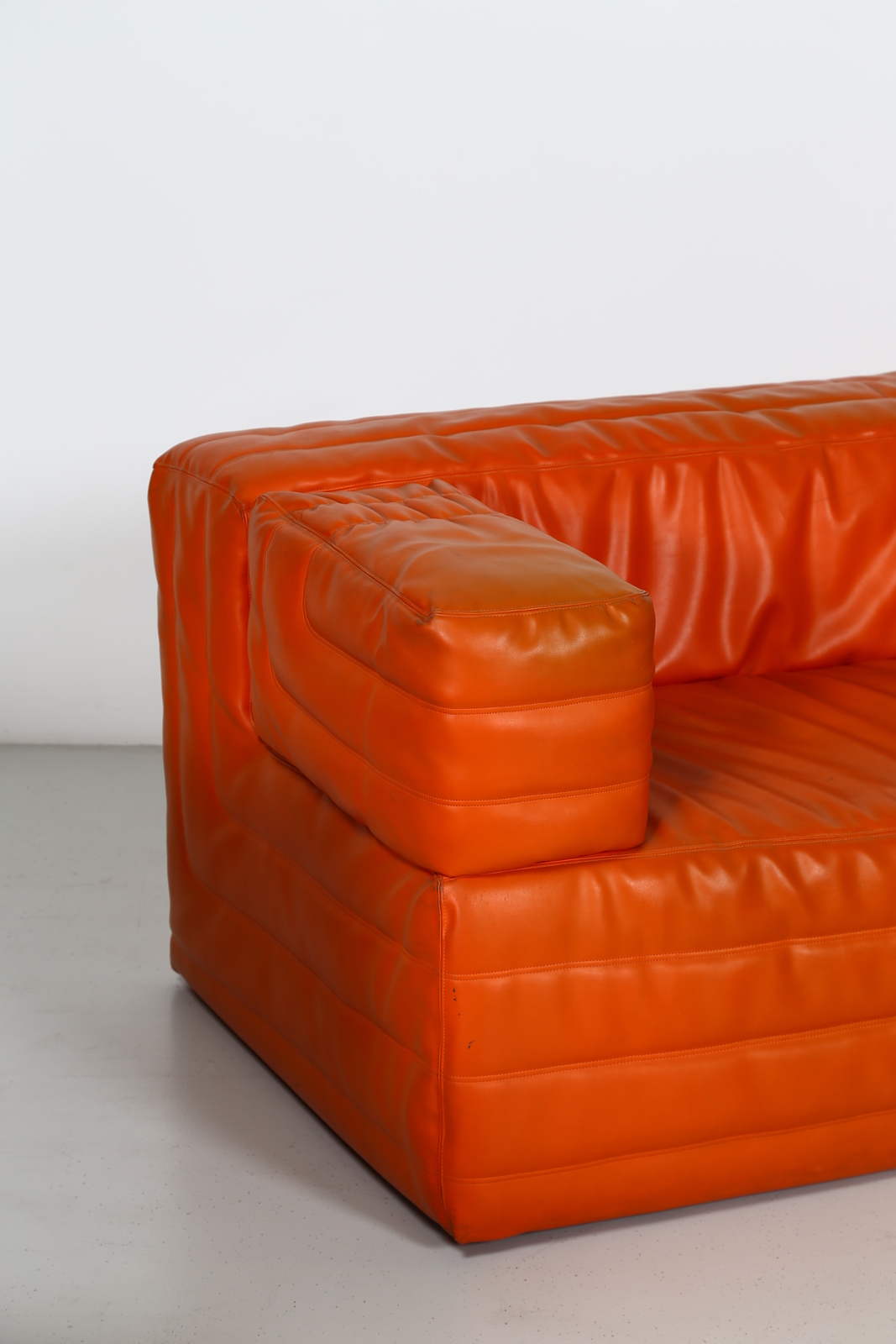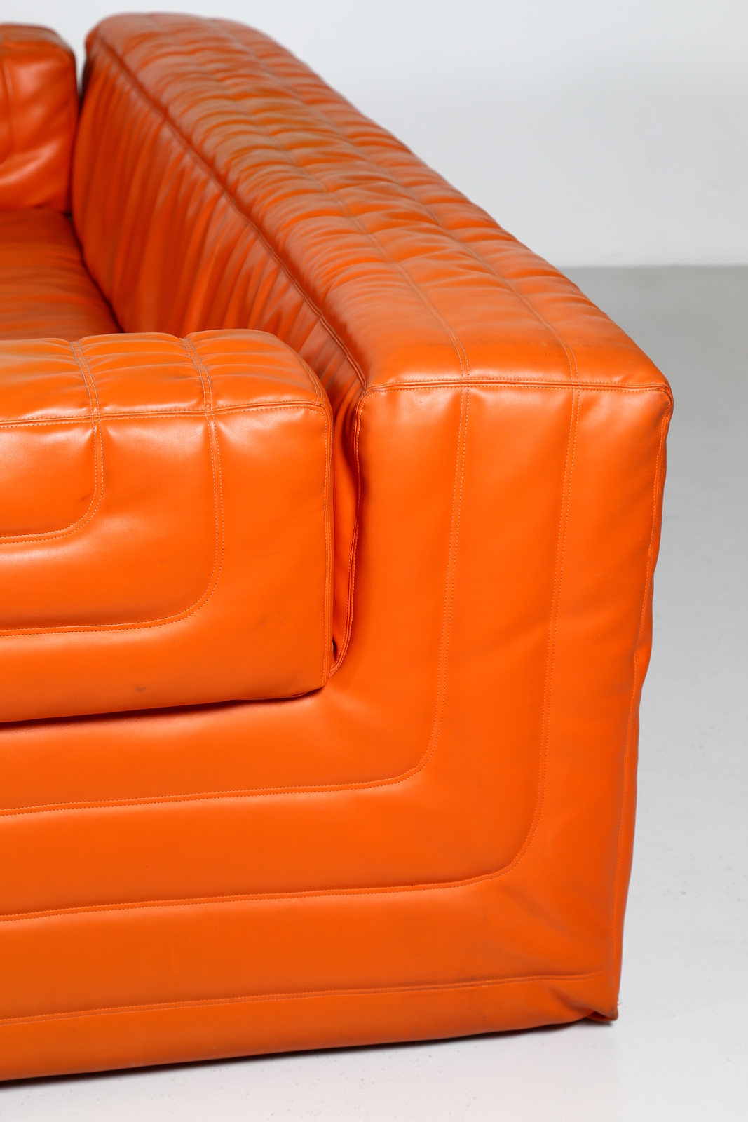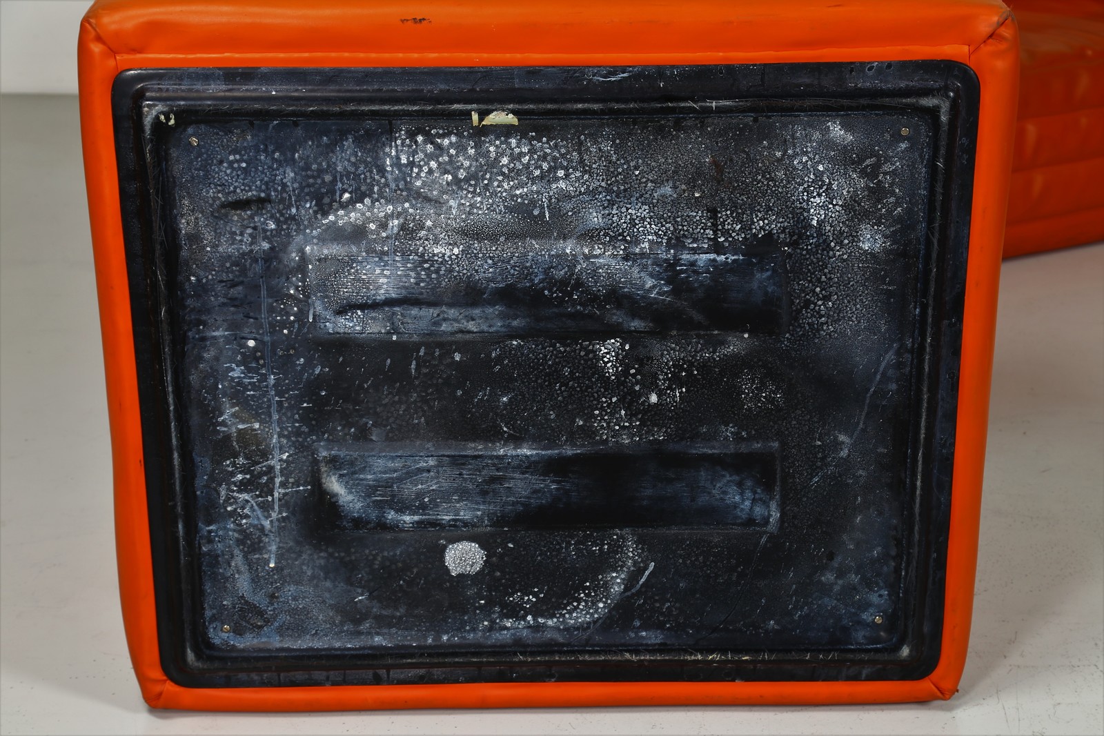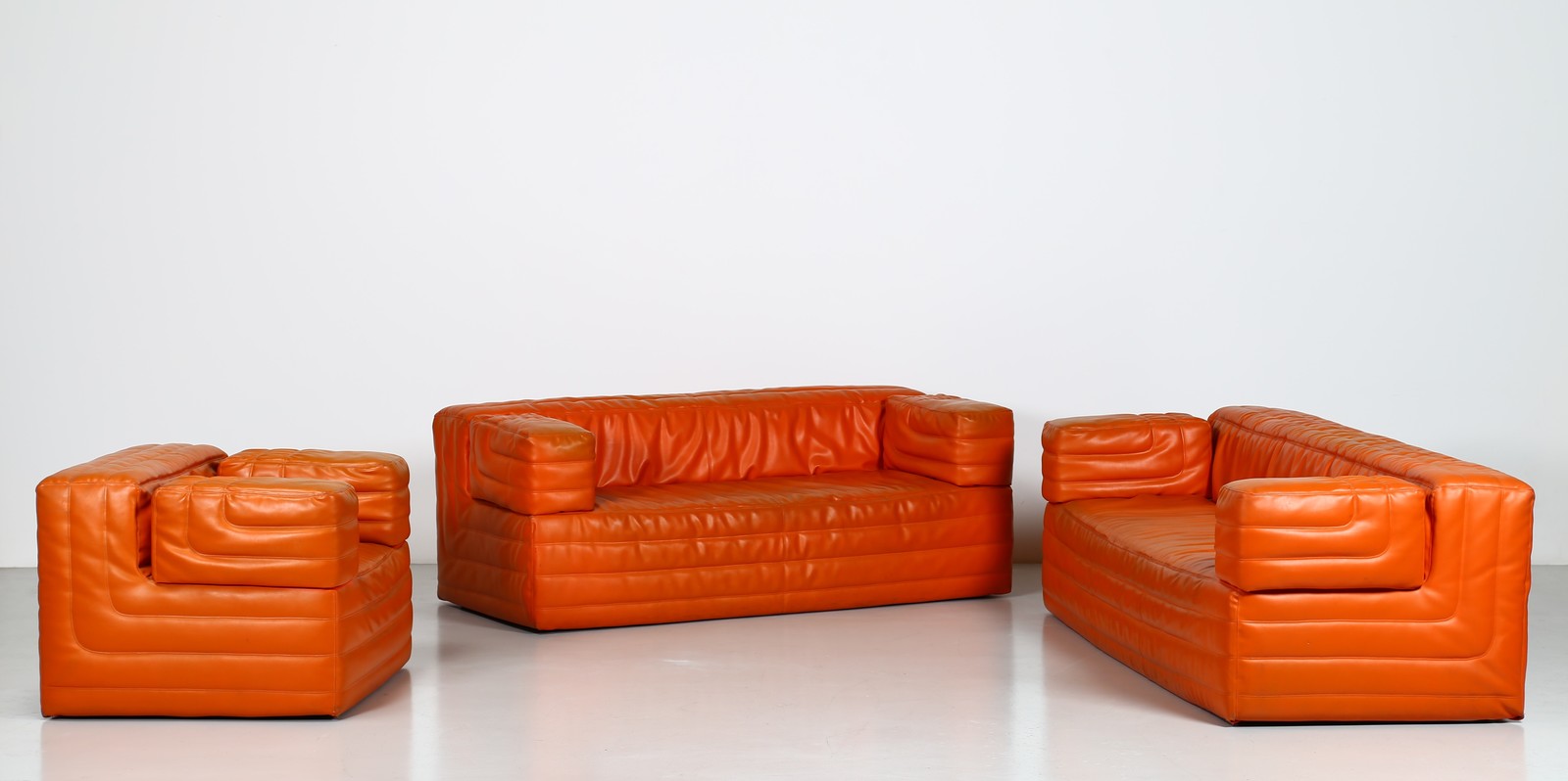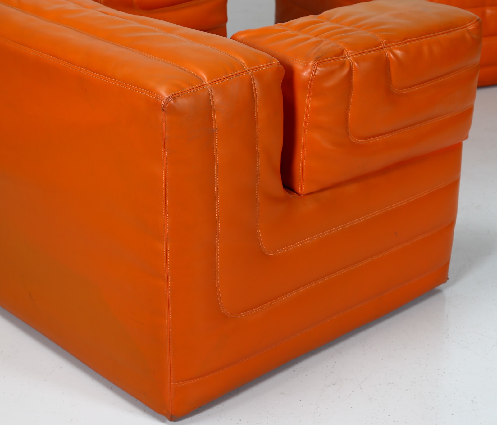 MANIFATTURA ITALIANA Coppia di divani e una poltrona. Skai. Cm 240,00 x 72,00 x 92,00. Plastica e skai originale, anni 60. Misure: Divano piccolo H 72 L 193 P 92 Poltrona H 72 L 110 P 92
