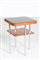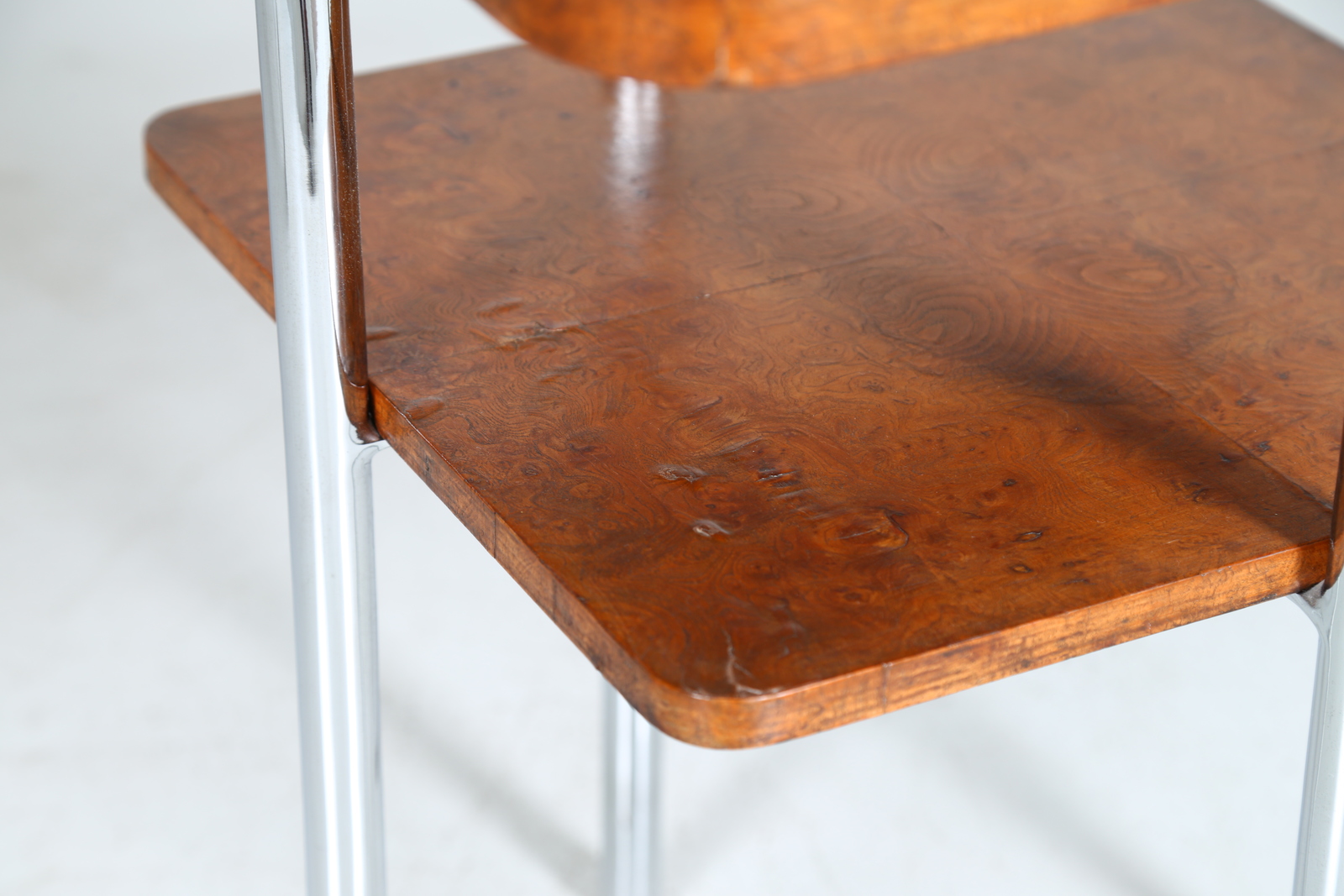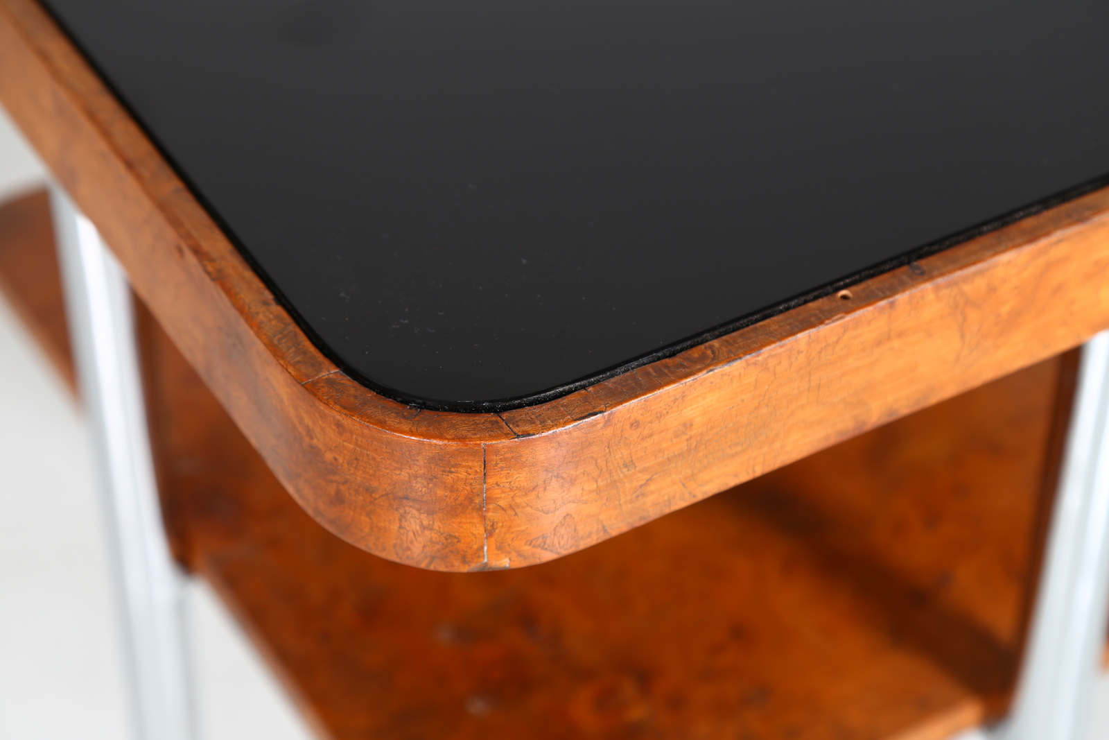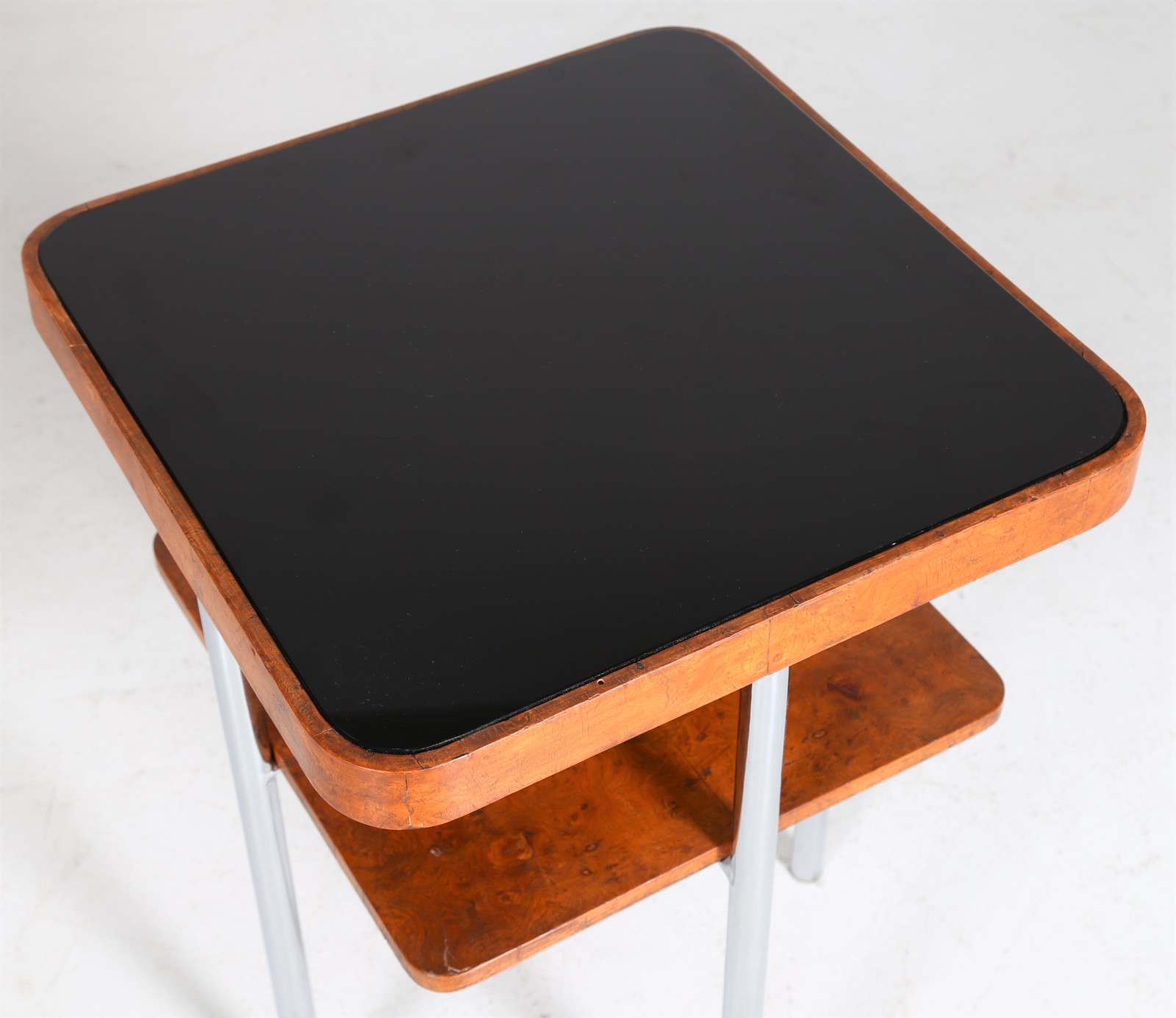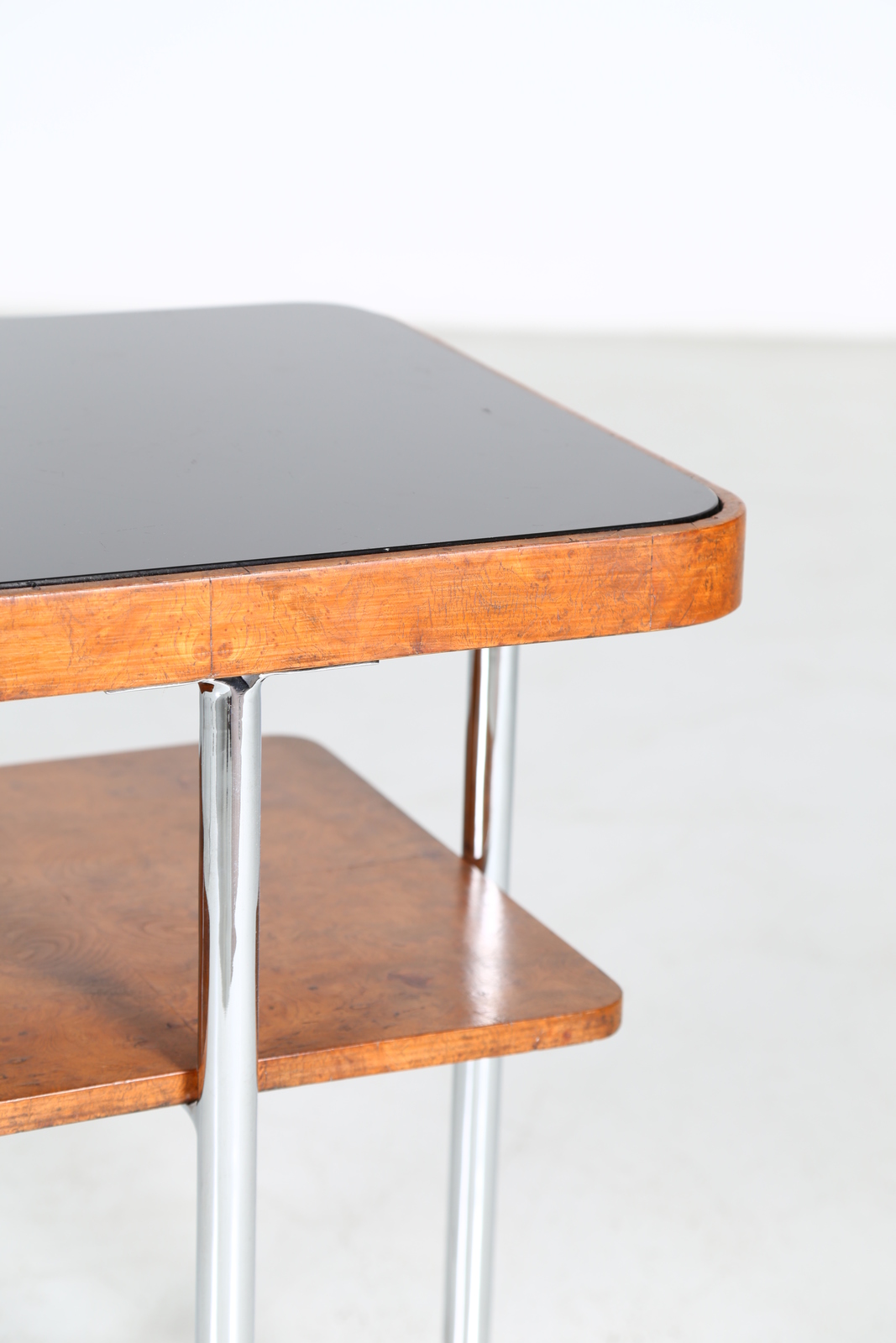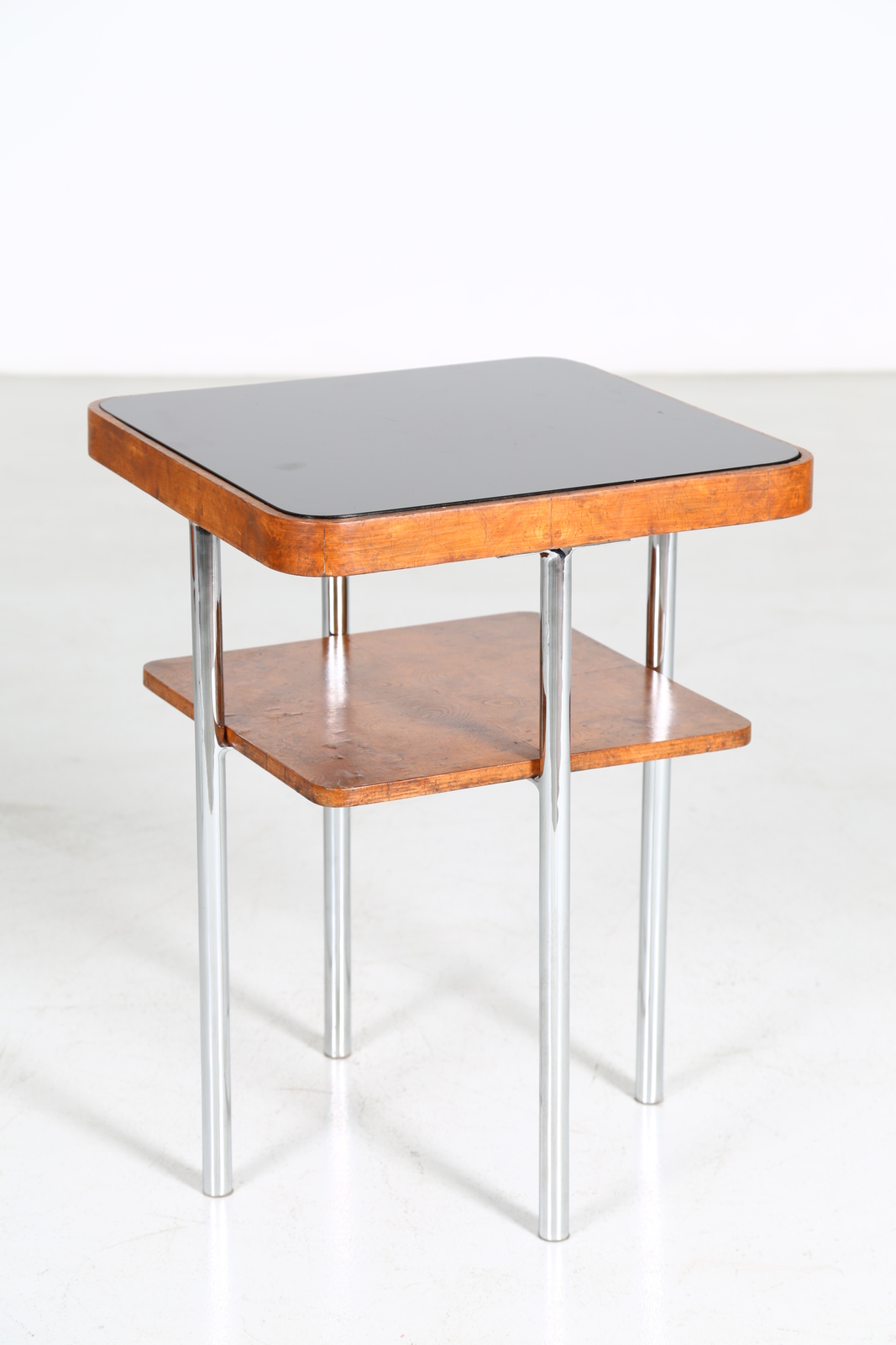 COVA MILANO Tavolino. Metallo cromato, vetro e radica di olmo. Cm 49,00 x 65,00 x 49,00. Metallo cromato, vetro e radica di olmo.