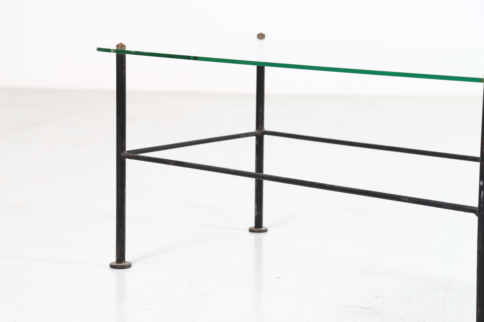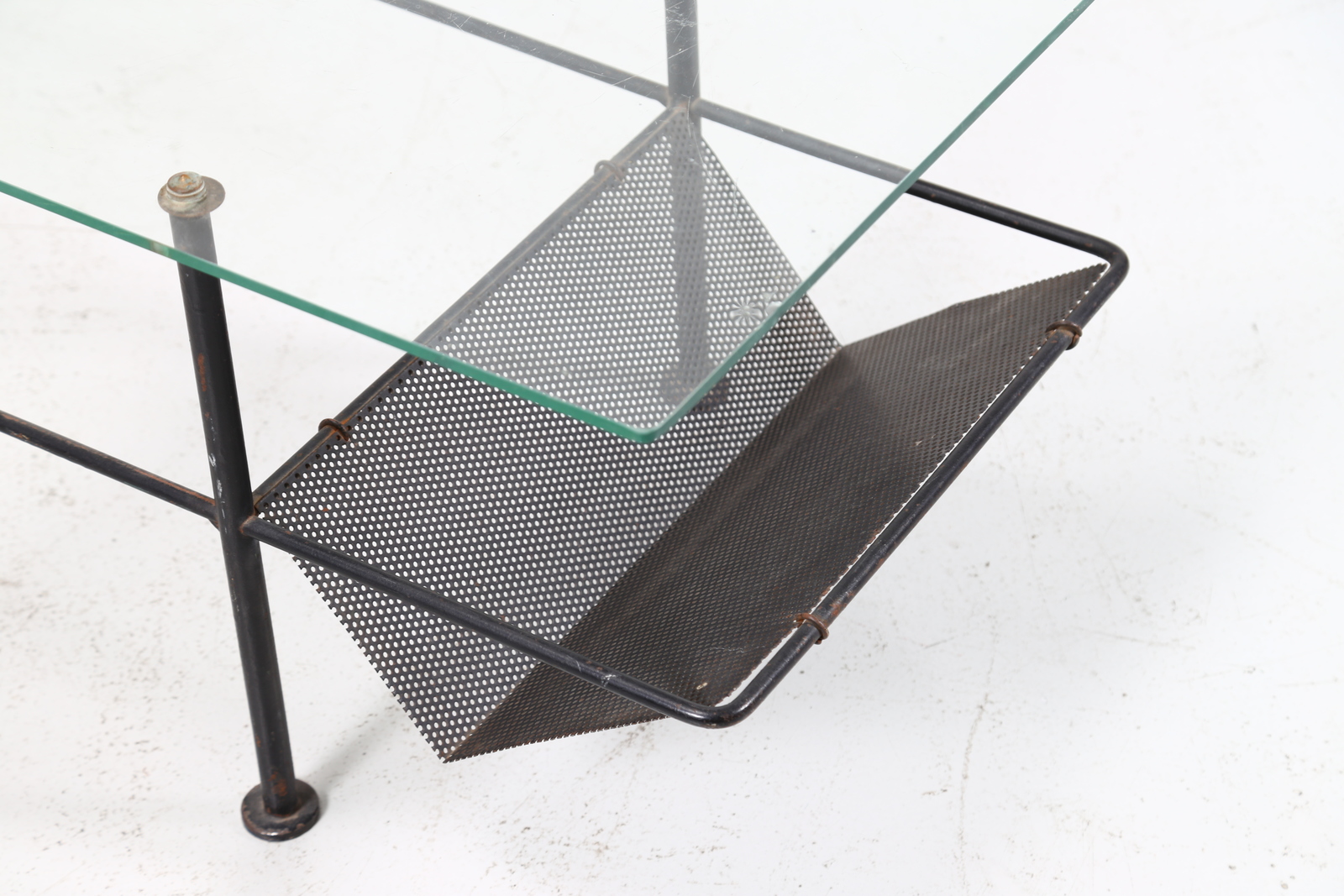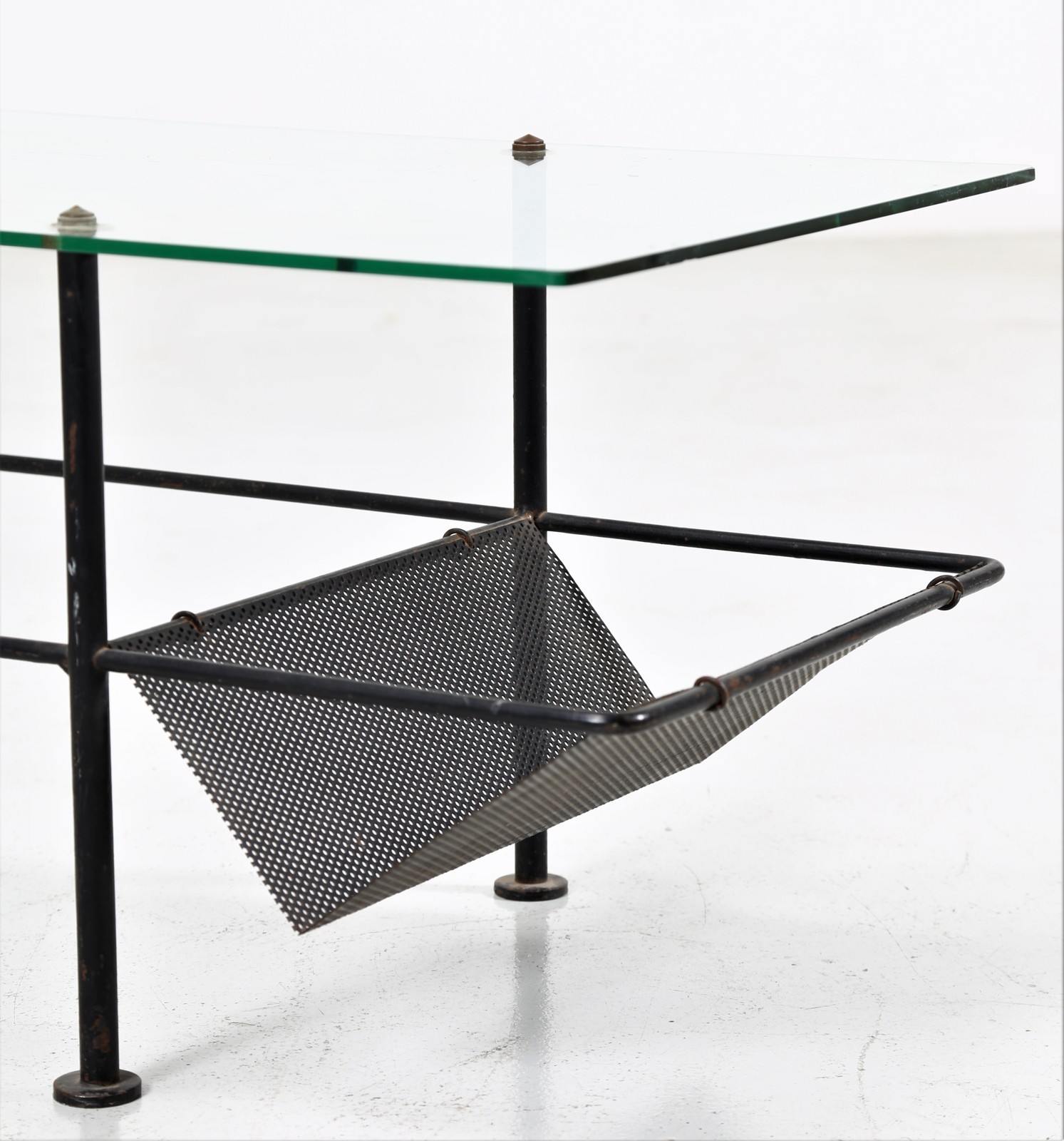 MATHIEU MATEGOT Coffee table with magazine rack. Lacquered metal, glass. Cm 105,00 x 41,50 x 48,00. Lacquered metal and glass (slightly chipped glass).