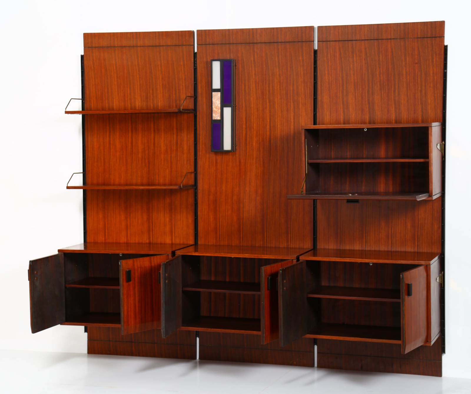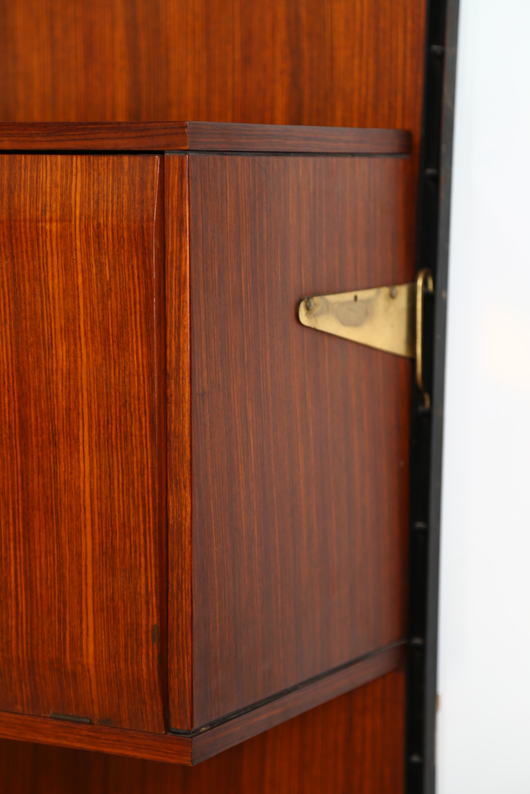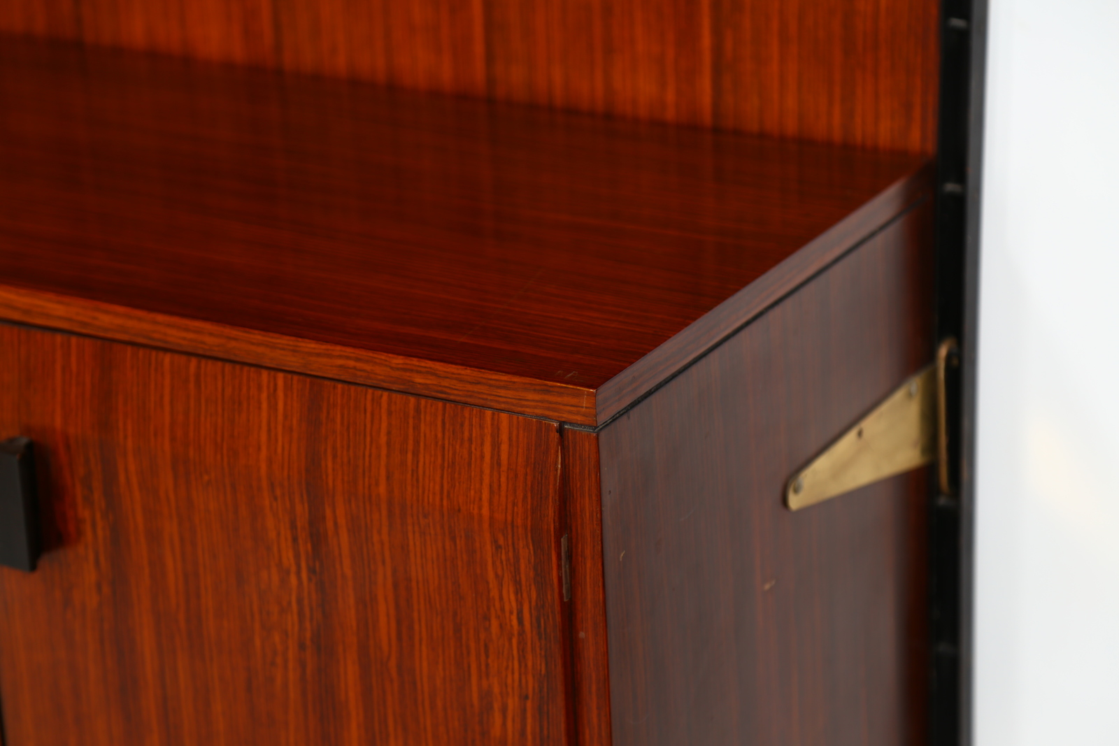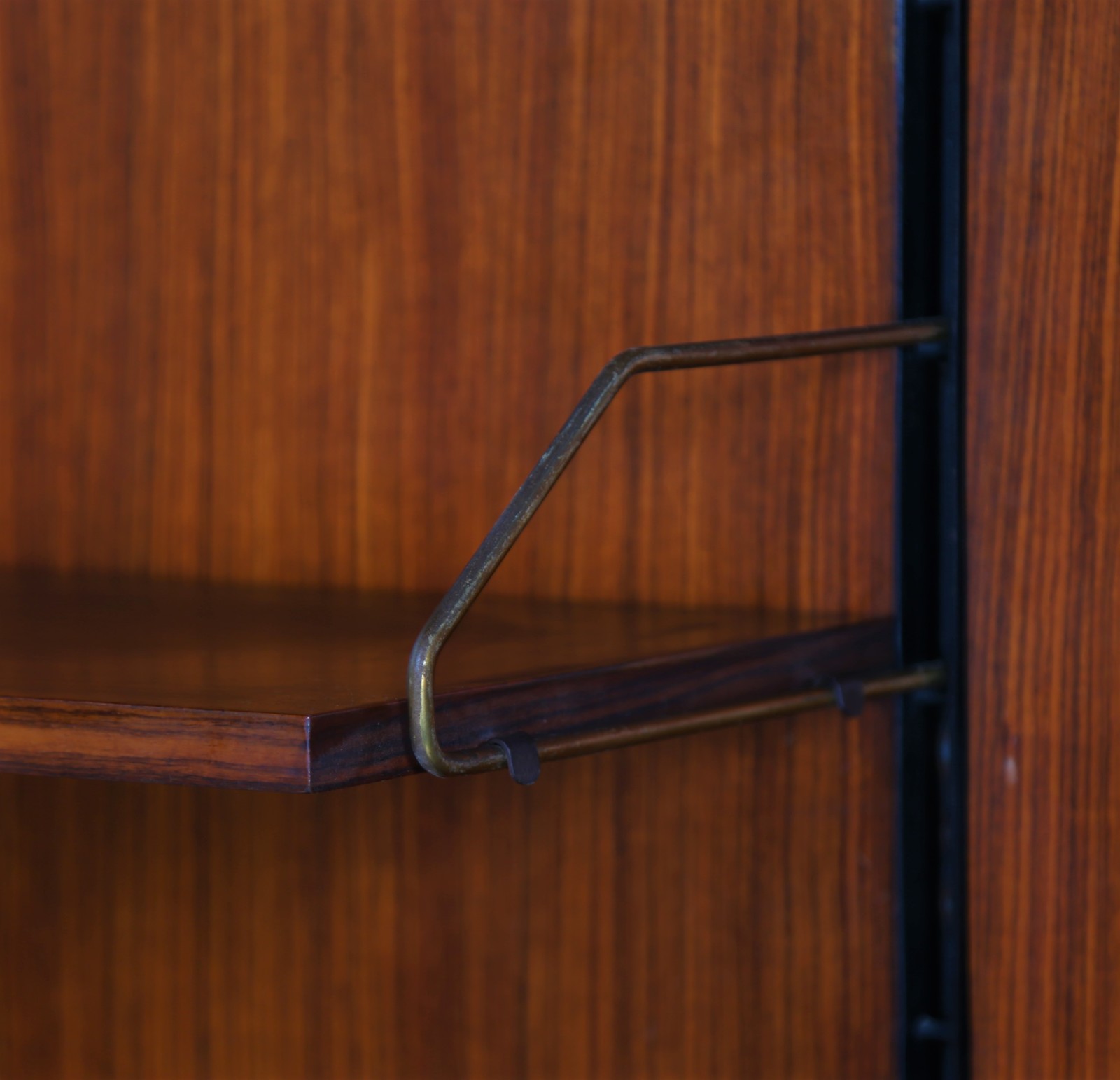 MANIFATTURA ITALIANA Libreria. Legno di palissandro e ottone. Cm 250,00 x 221,00 x 43,00. Legno di palissandro, ottone e metallo laccato, anni 60.