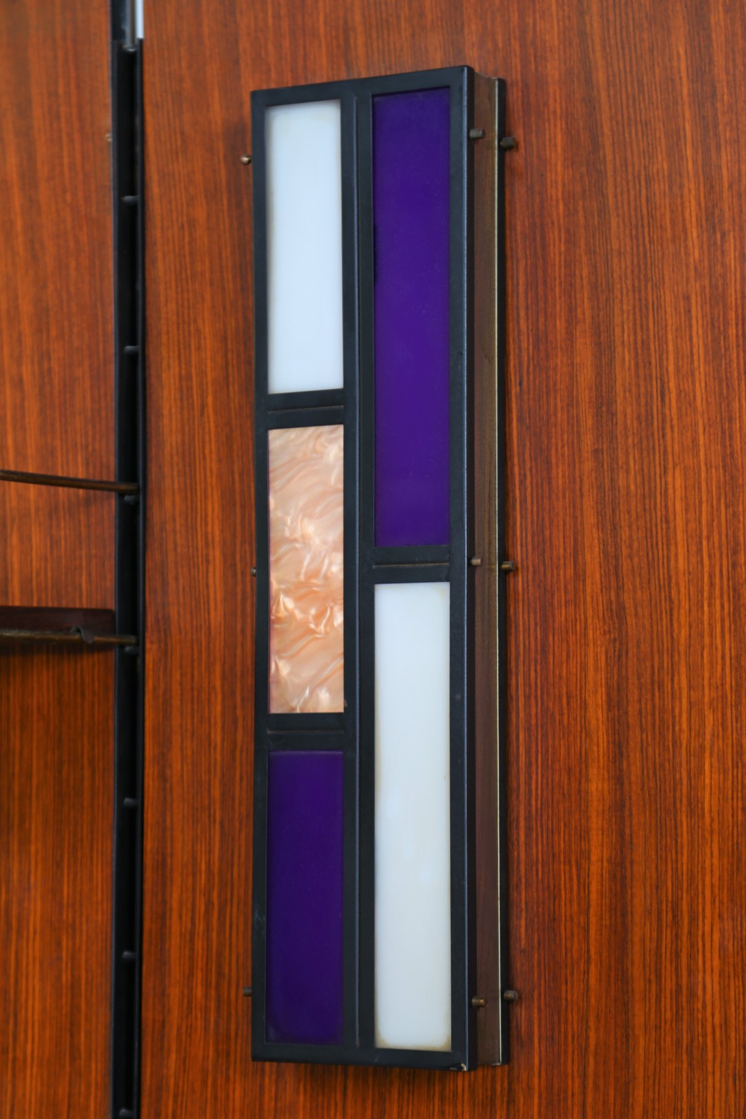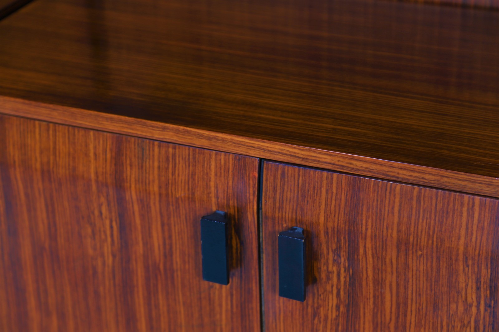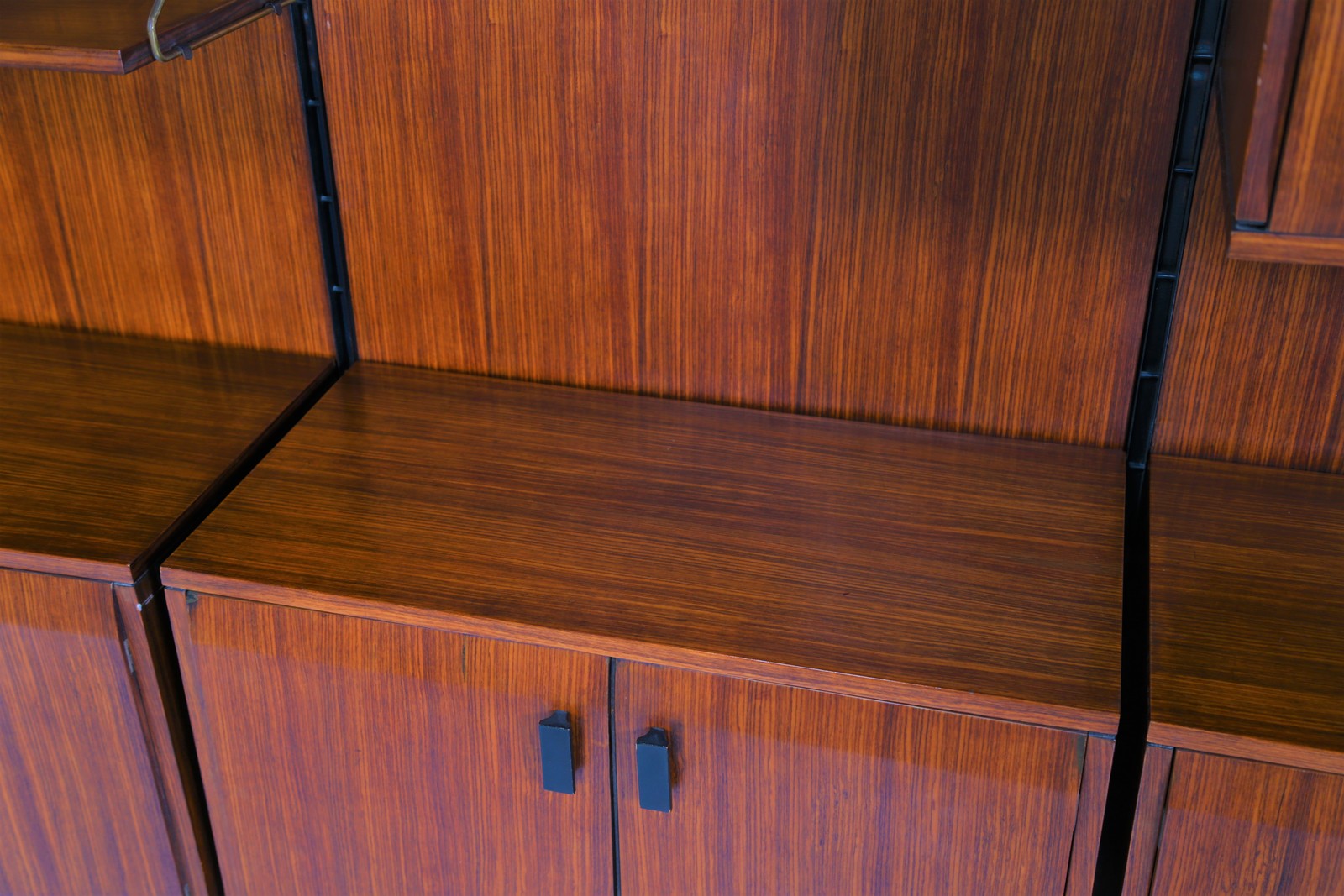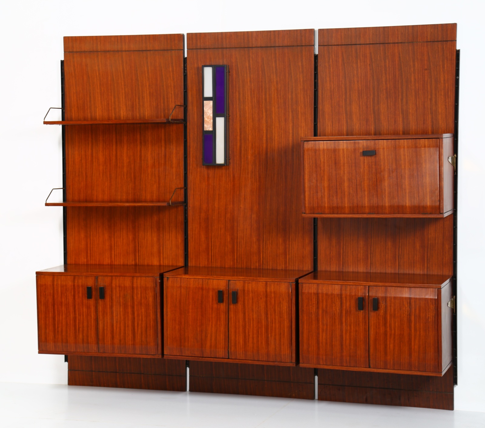 MANIFATTURA ITALIANA Libreria. Legno di palissandro e ottone. Cm 250,00 x 221,00 x 43,00. Legno di palissandro, ottone e metallo laccato, anni 60.