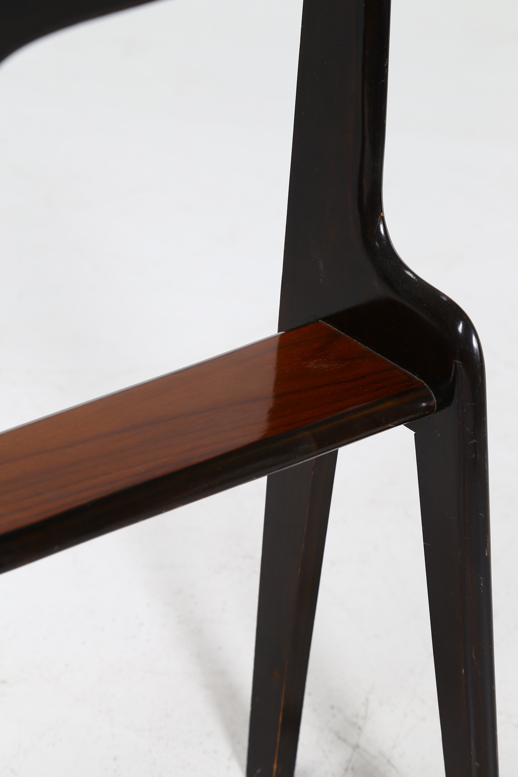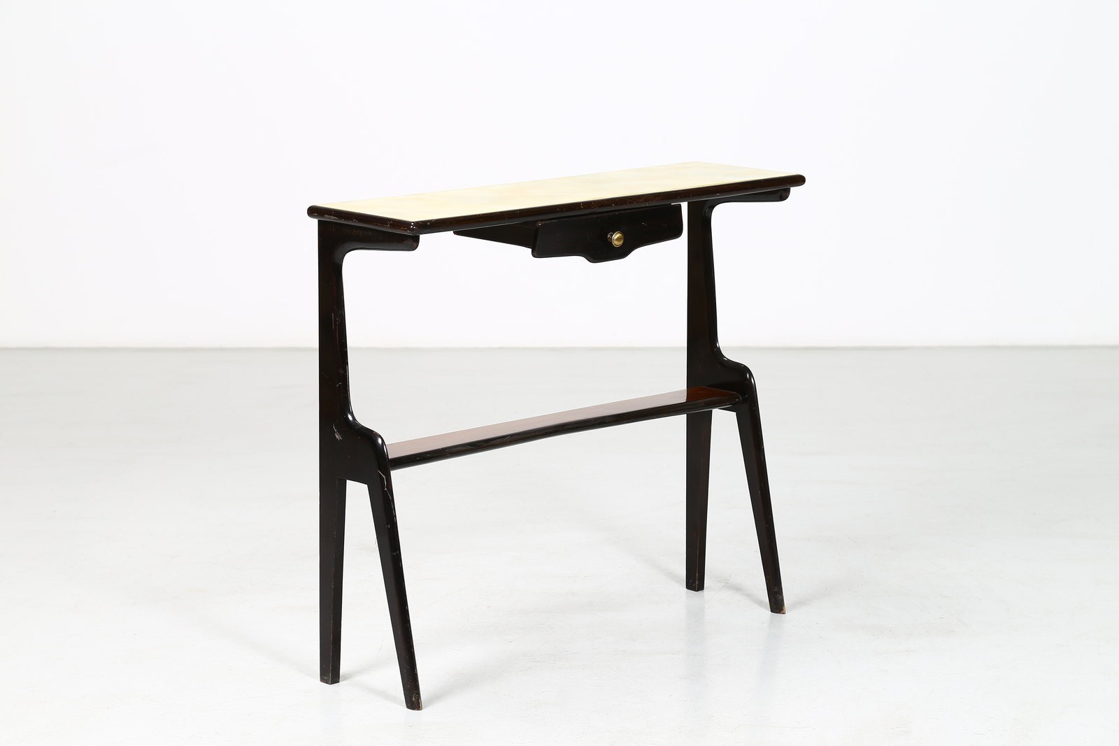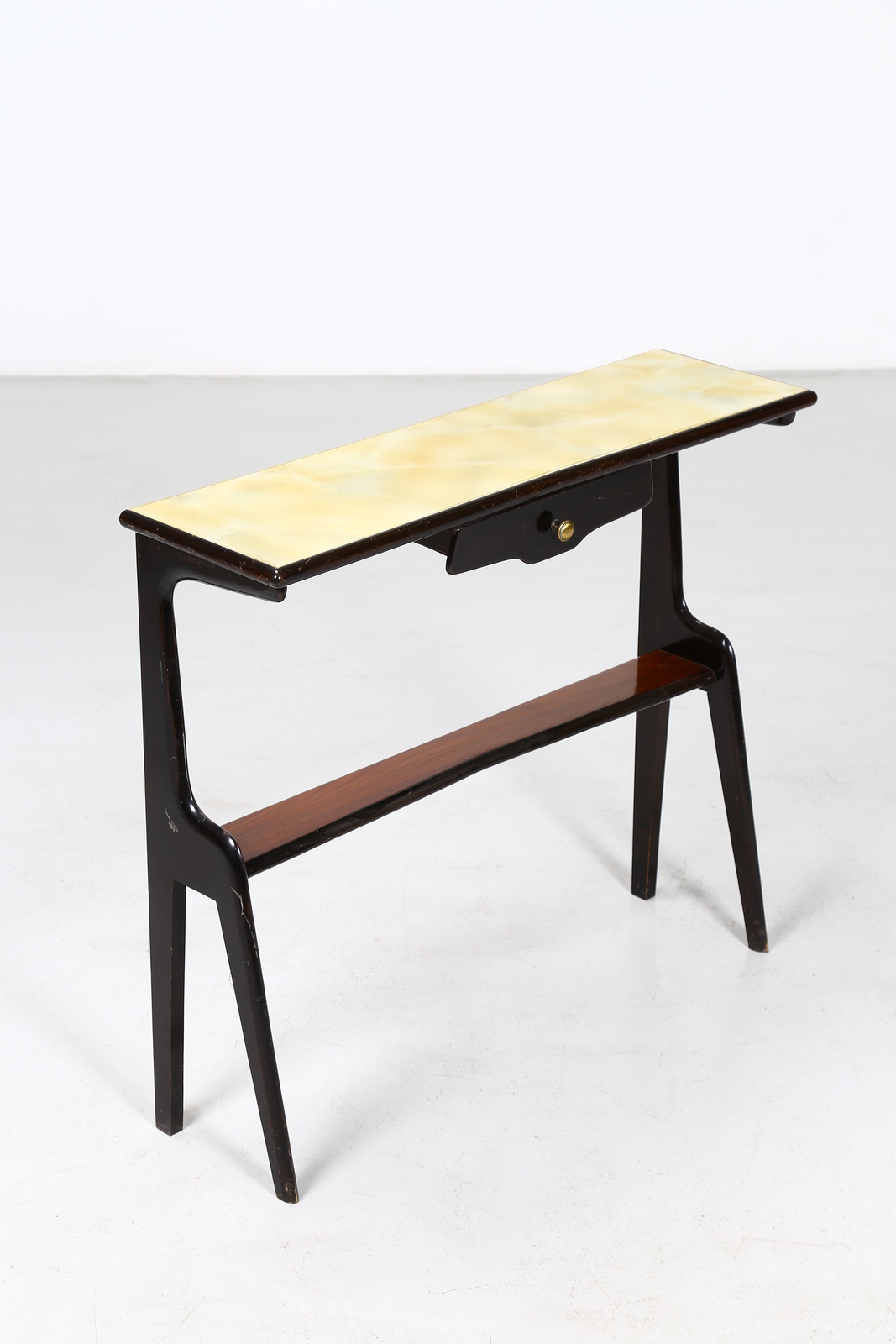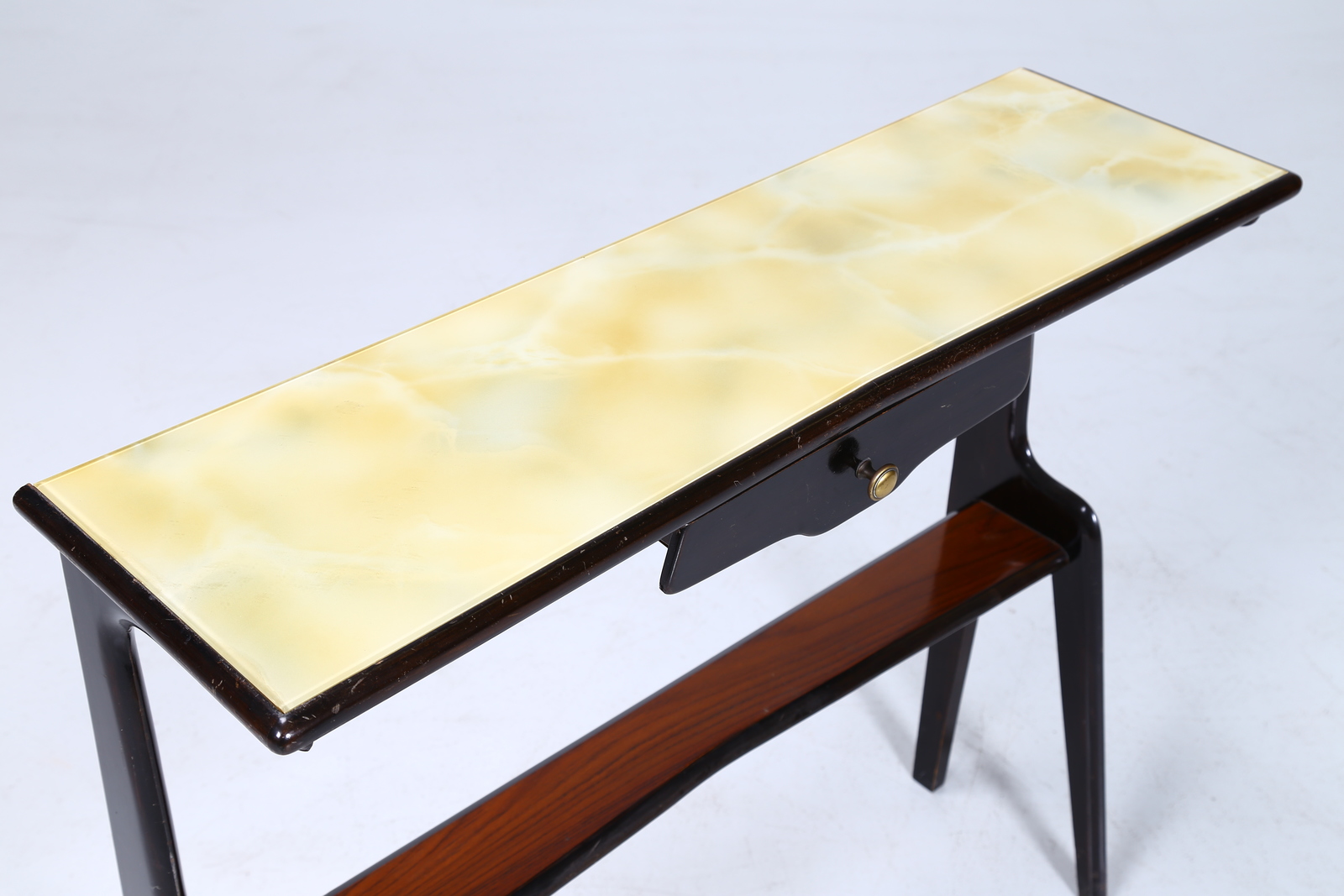 ITALIAN MANUFACTURE Console. Ebonized wood, rosewood and glass. Cm 94,00 x 82,00 x 27,00. Ebonized wood, rosewood and glass, 50s.
