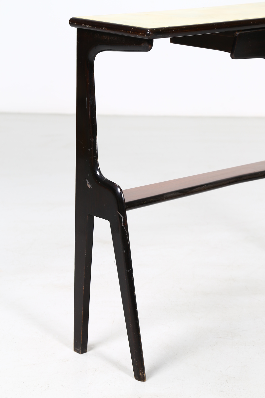 MANIFATTURA ITALIANA Consolle. Legno ebanizzato, legno di palissandro e vetro. Cm 94,00 x 82,00 x 27,00. Legno ebanizzato, legno di palissandro e vetro. Anni 50.