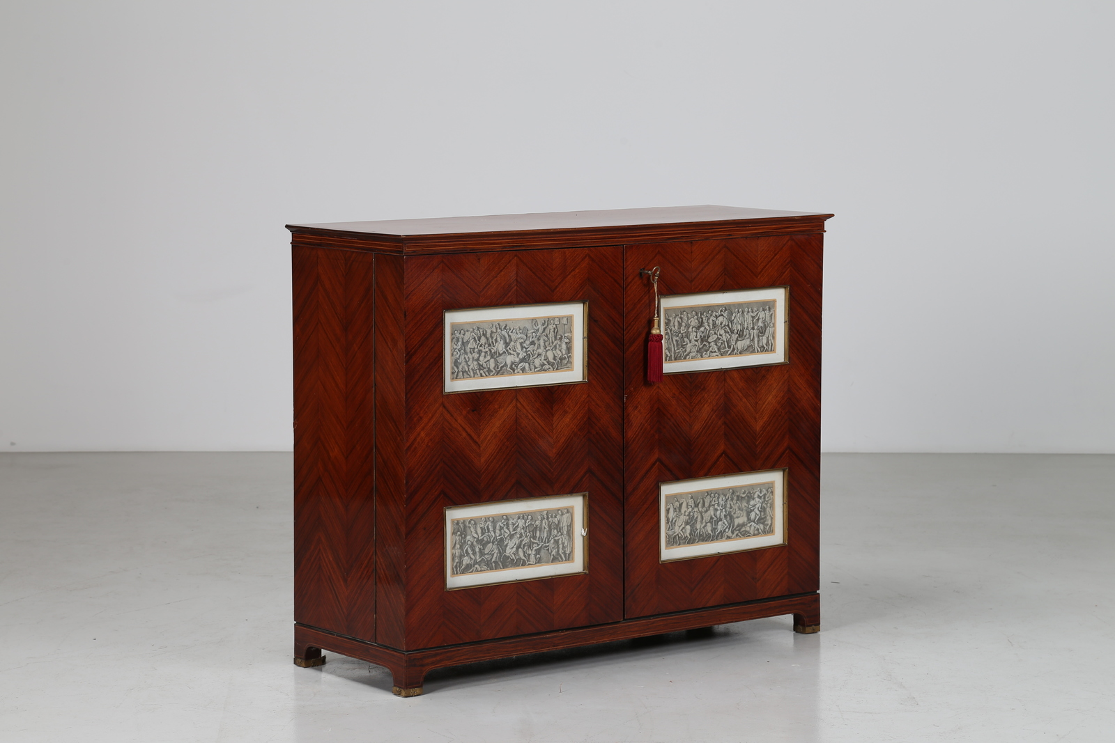 . Legno di palissandro. Cm 122,00 x 100,00 x 46,00. Legno di palissandro con dettagli in ottone, ante con stampe decorate, anni 40.