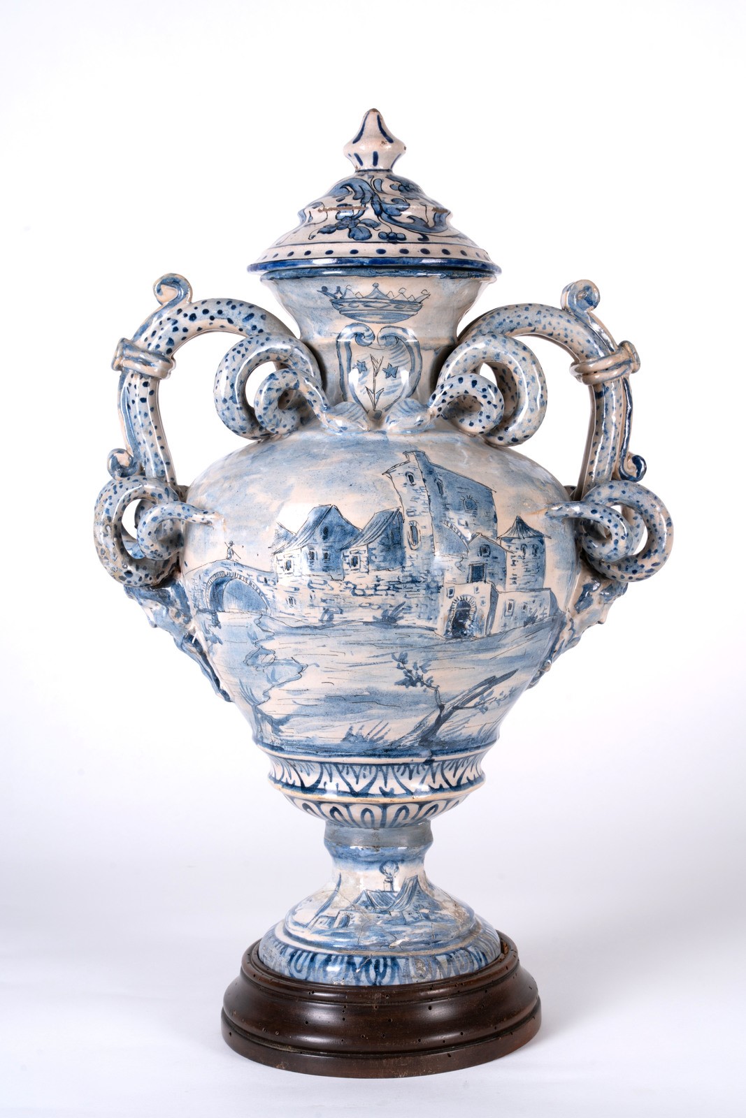 MANIFATTURA SAVONESE DEL XIX SECOLO Majolica vase decorated in blue monochromy on white background with landscape and Diana and Endimione. . Cm 38,00 x 57,00 x 30,00. Coat of arms. Restorations. With base: h 62,5 cm.