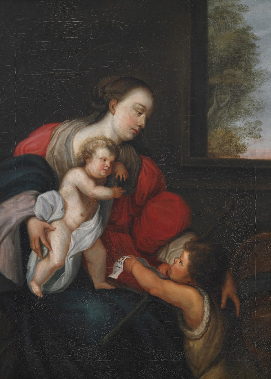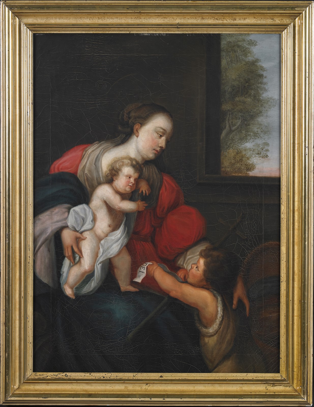 19th CENTURY ARTIST Madonna with child and Saint Giovannino. . Oil on canvas . Cm 64,00 x 86,00. . Cornice presente