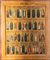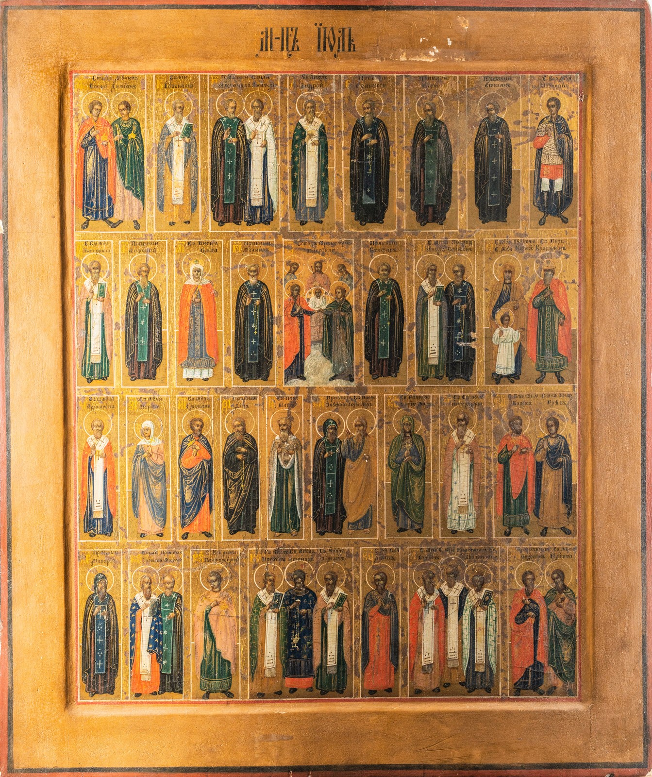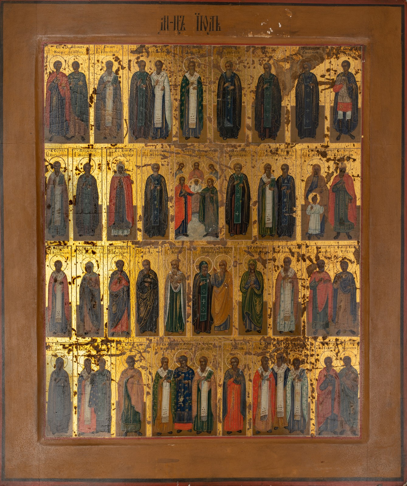 ICONA RUSSA DEL XIX SECOLO Array of saints and Holy Family. Egg tempera on board. Cm 37,00 x 45,00. Defects.