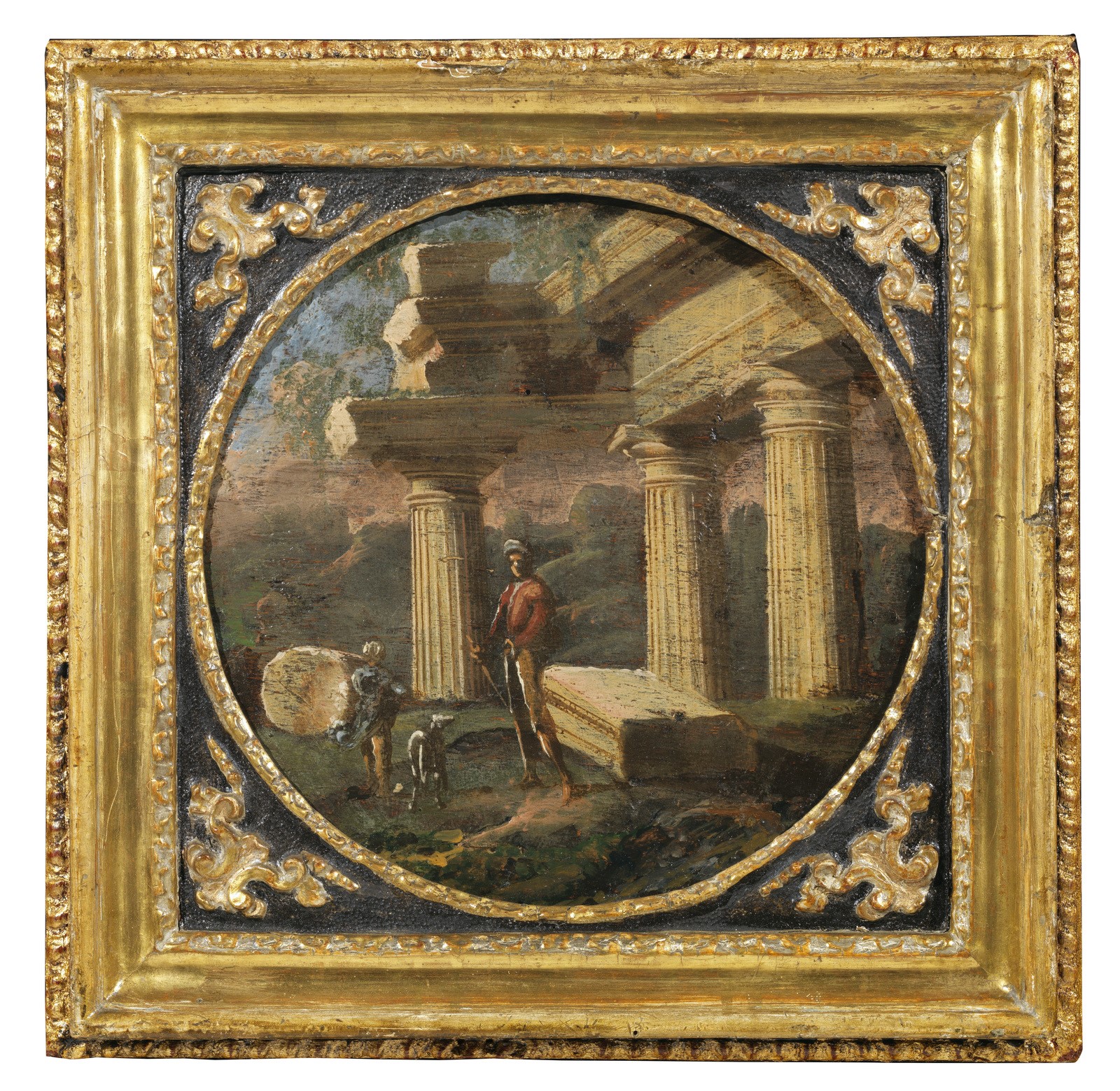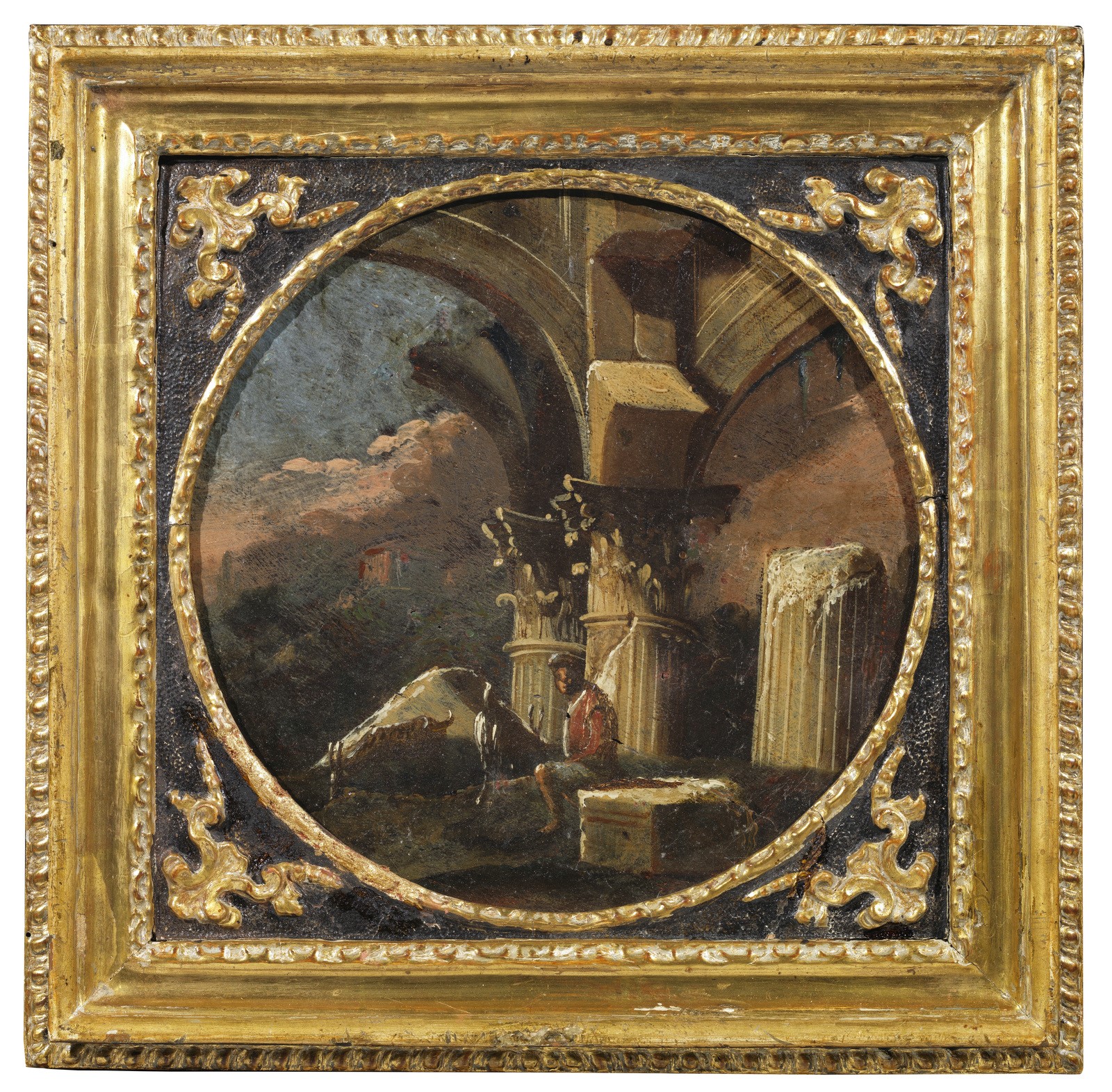 LUCIANI ASCANIO (1621 - 1706) Attributed to. A pair of rouds with "capriccio" with figures. Oil on canvas . Cm 25,00. . Cornice presente