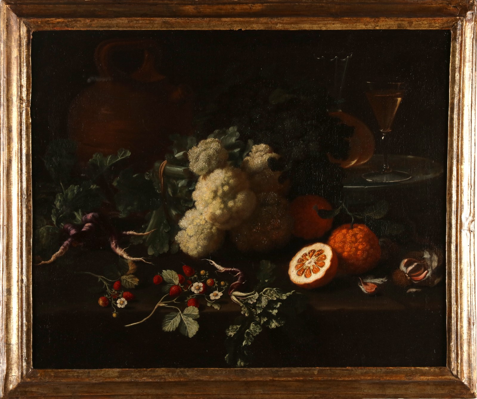 17th CENTURY PAINTER Pair of 17th century still life of fruits and still life with ceramic objects. . Oil on canvas . Cm 76,00 x 61,00. . Cornice presente