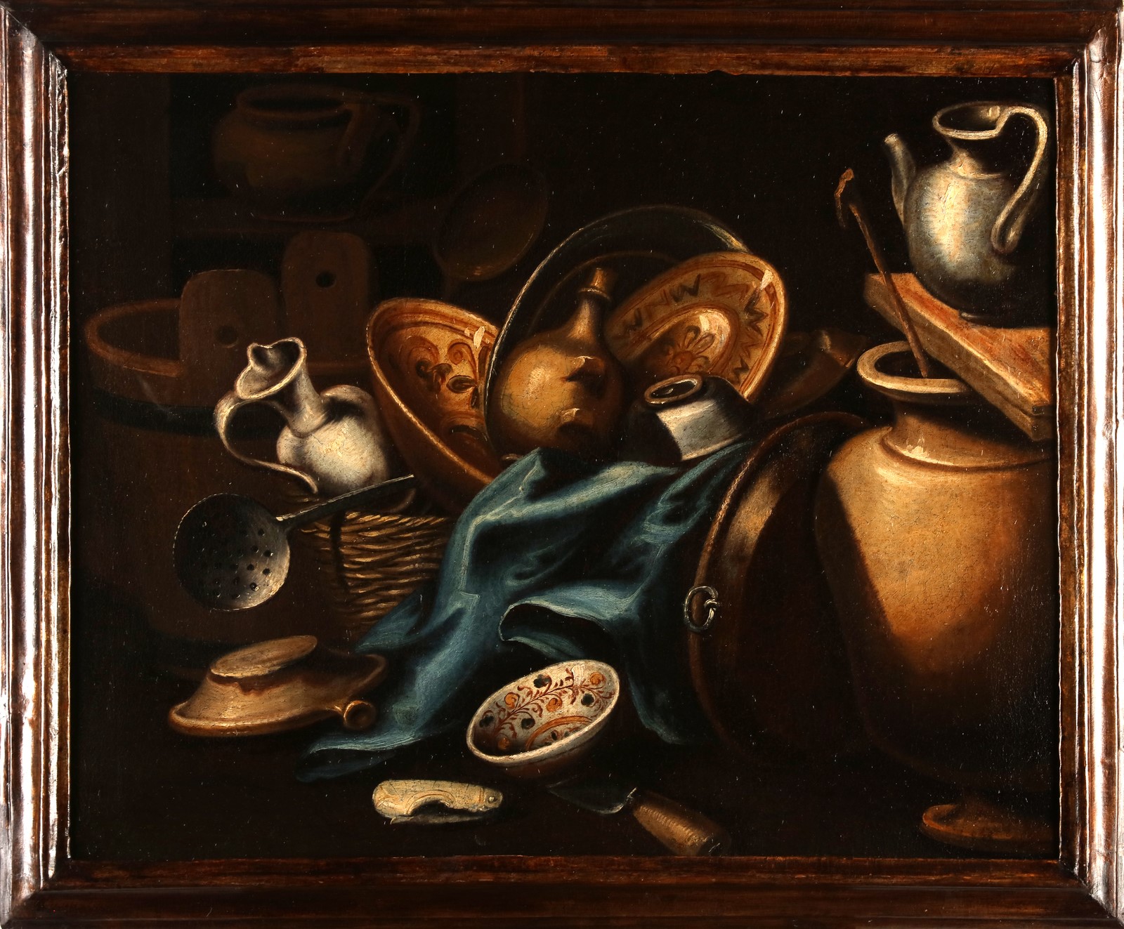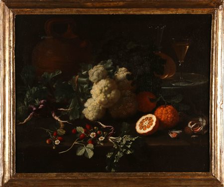 PITTORE DEL XVII SECOLO Coppia di dipinti: Natura morta di frutta e Natura morta con oggetti in ceramica. Olio su tela . Cm 76,00 x 61,00. . Cornice presente