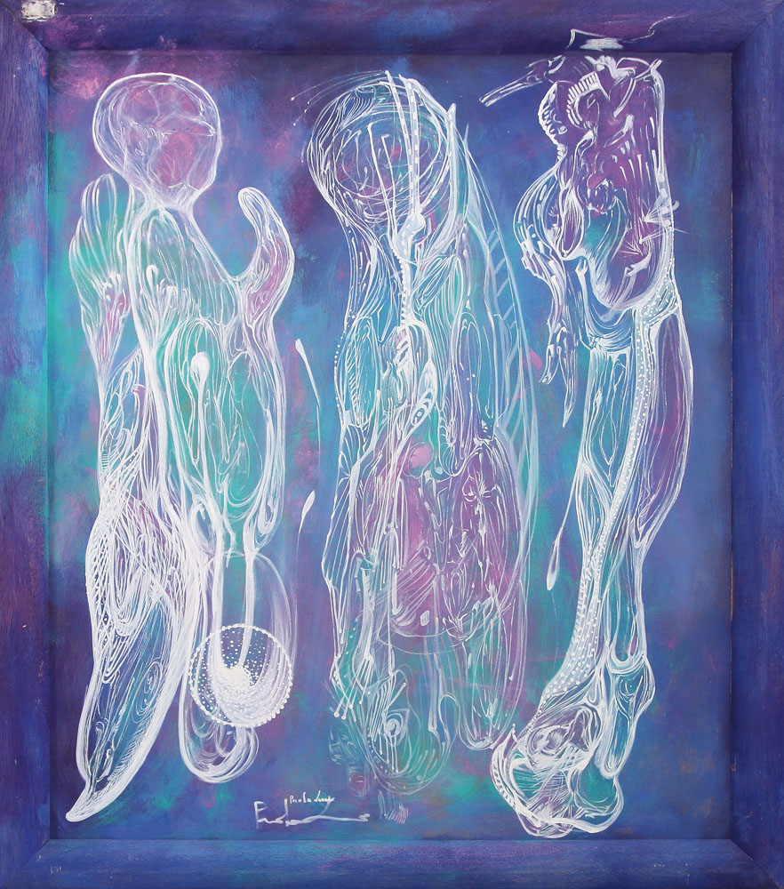 PAOLA LUSSO Torino 1962  Uomini, Dei e semidei...., 2007 acrilico su tavola con cornice invasa cm. 78,5x69, firma in basso al centro, archivio numero LP23L207T dell'artista, etichetta e timbro dell'esposizione Arti Figurative della Società Promotrice Belle Art (TO) al retro.