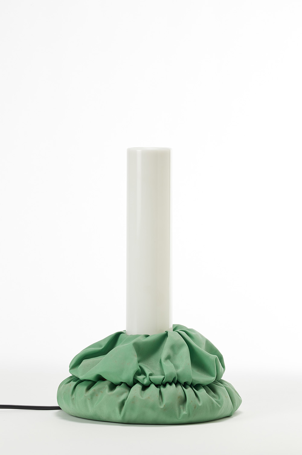 Lampada da tavolo modello "Cloche". Produzione Sirrah, Italia, 1982. Tessuto verde e metacrilato. (h cm 36) (lievi difetti)