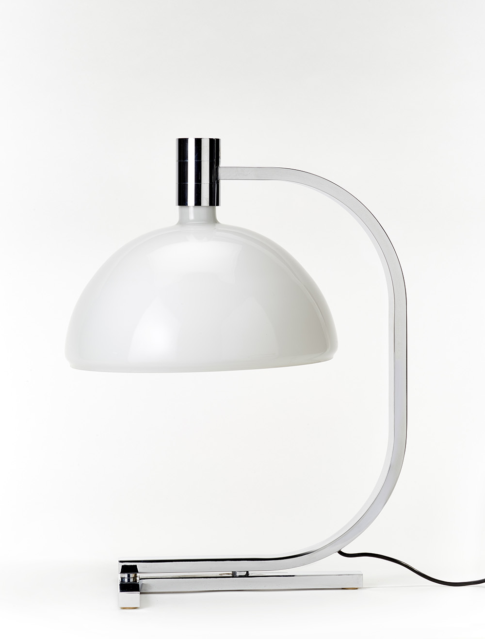 Lampada da tavolo della serie "AM/AS". Produzione Sirrah, Imola, 1969. Acciaio e vetro opalino. (h cm 65; d cm 38) (lievi difetti)