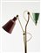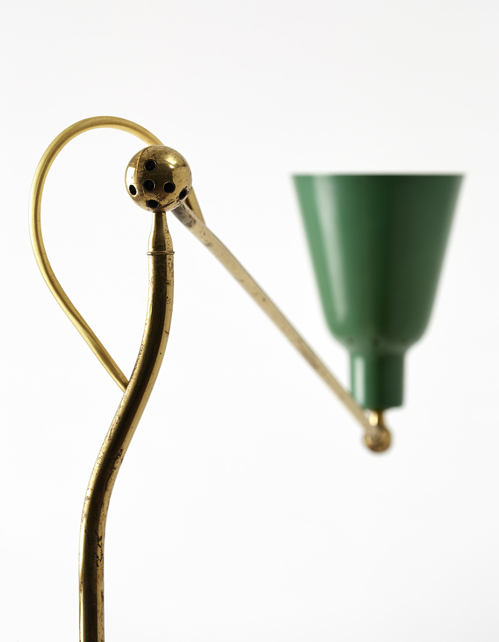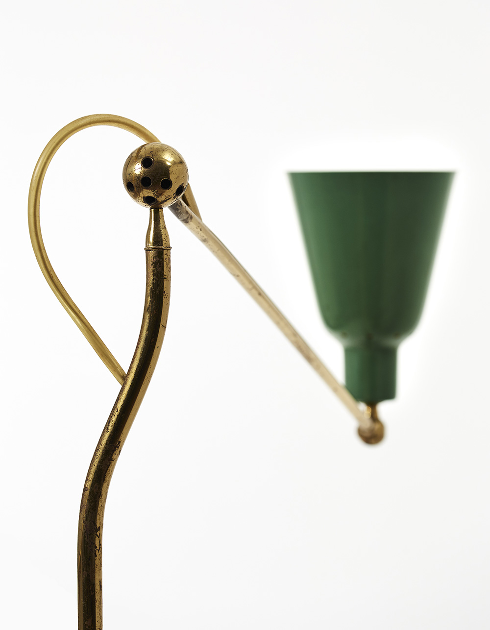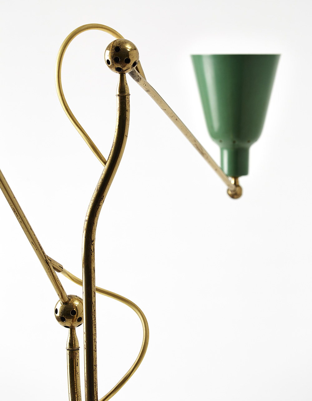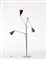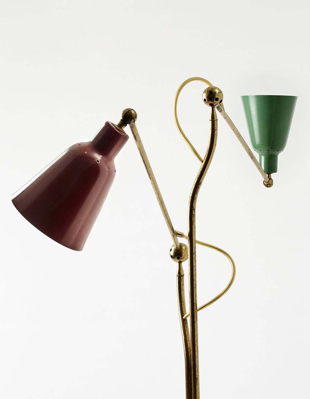 Lampada da terra. Produzione Arredoluce, Monza, 1950ca. N. cat. 19. Base in marmo, struttura in ottone, bracci posizionabili mediante una sfera forata che si innesta su un perno. Diffusori in alluminio verniciato in verde, azzurro e rosso. (h max cm 231) (lievi difetti)