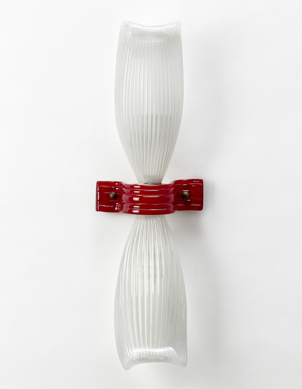 Lampada da parete in vetro soffiato a canne di reticello lattimo, fascia centrale in vetro soffiato trasparente rosso. Struttura in ottone laccato bianco. Disegno n. 5825 del Catalogo Rosso Venini. Murano, anni '50. (cm 57x18x9,5)