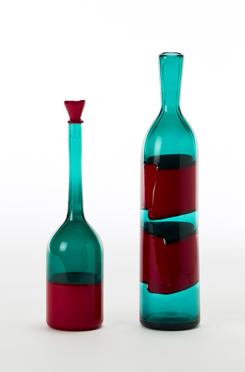 Lot composed of a bottle with an elongated neck in transparent green glass decorated with horizontal opaque red bands combined with an incalmo bottle with a narrow and elongated neck in transparent green glass and a horizontal red opaque band with a red transparent glass cap of the series "Fasce orizzontali ". Murano, 1970s/1980s. Signed under the base "venini italia". (h 37 cm. h 31 cm) (losses)