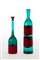 Lotto composto da una bottiglia con collo allungato in vetro trasparente verde decorato da fasce orizzontali opache rosse unito a una bottiglia a incalmo a collo stretto allungato in vetro trasparente verde e fascia orizzontale opaca rossa con tappo in vetro trasparente rosso della serie "Fasce orizzontali ". Murano, anni '70'/80. Firmati sotto la base "venini italia". (h cm 37, h cm 31) (mancanze)