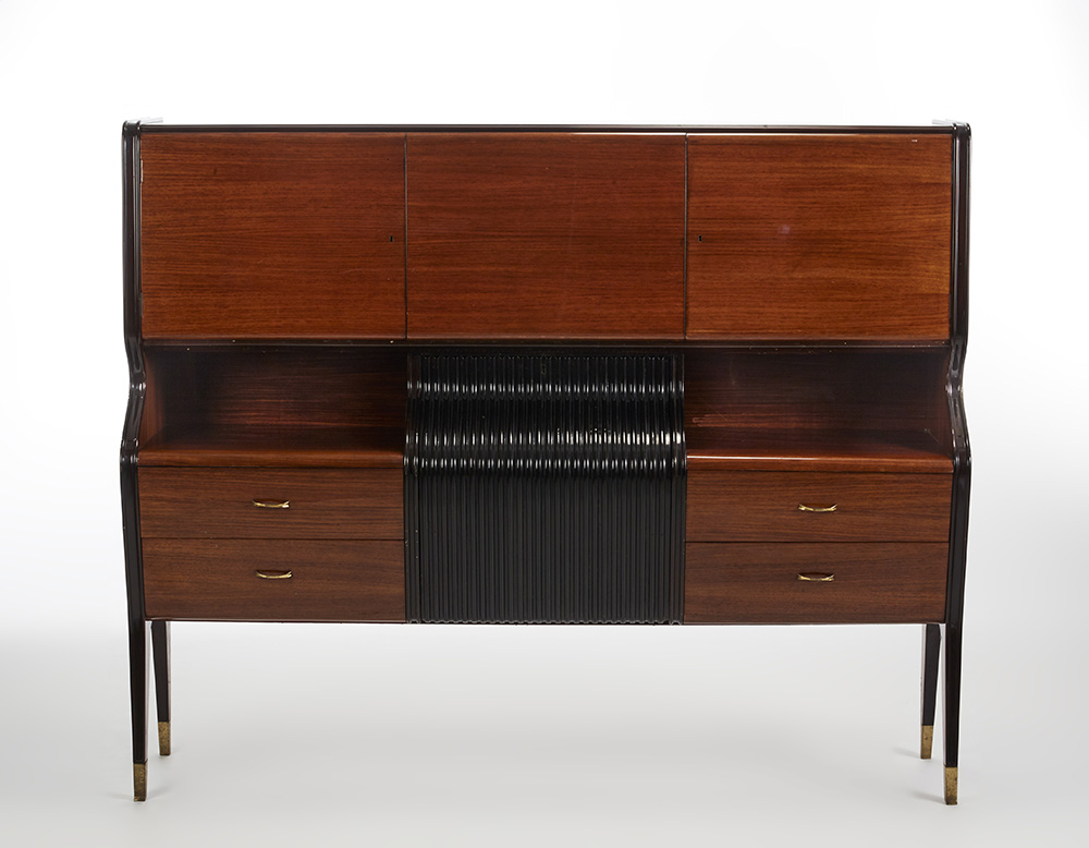 Contro-buffet. Esecuzione Arredamento Borsani, Varedo, anni '40. Legno massello e impiallacciato in palissandro indiano, guarnizioni in ottone, interni in acero con scomparto bar a vetri. (cm 180x146x44) (lievi difetti)