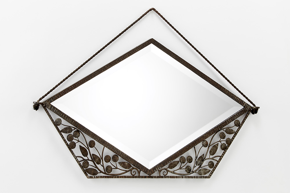 Art Déco wrought and welded iron mirror decorated with geometrical racemes. France, 1930s. Signing in the frame "R. Izard". (69x42 cm.) (slight defects)
