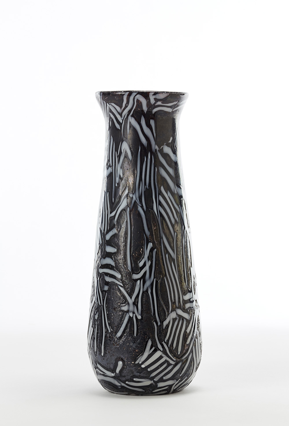 Vaso in vetro soffiato ascrivibile alla serie "Nerox". Probabile esecuzione F.lli Toso. Murano, anni '60. (h cm 34,5)