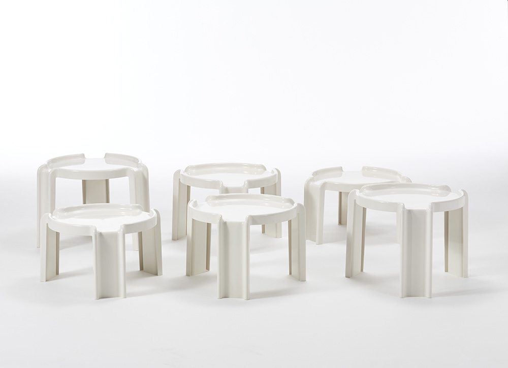 Lotto di due set di tre tavolini impilabili modello "4905-6-7". Produzione Kartell, Milano, 1968. Abs bianco. Marcati sotto la seduta. Segnalazione al Compasso d'Oro del 1970. (h cm 37,33,29 e d cm 43) (lievi difetti)