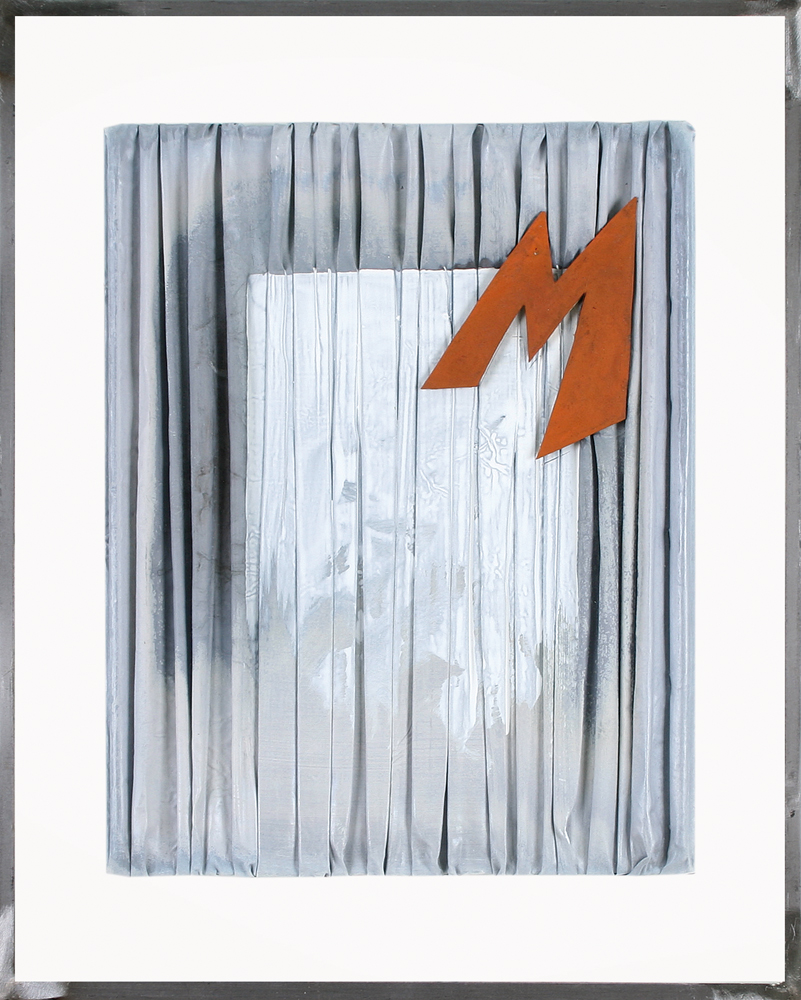 UMBERTO MARIANI Milano 16/11/1936 Senza titolo: M, 2008 acrilico su piombo operato applicato su tavola cm. 42,5x33, con cornice dell'artista cm. 56x45, firma, titolo e anno al retro, dichiarazione d'autenticità dell'artista su 2 foto.