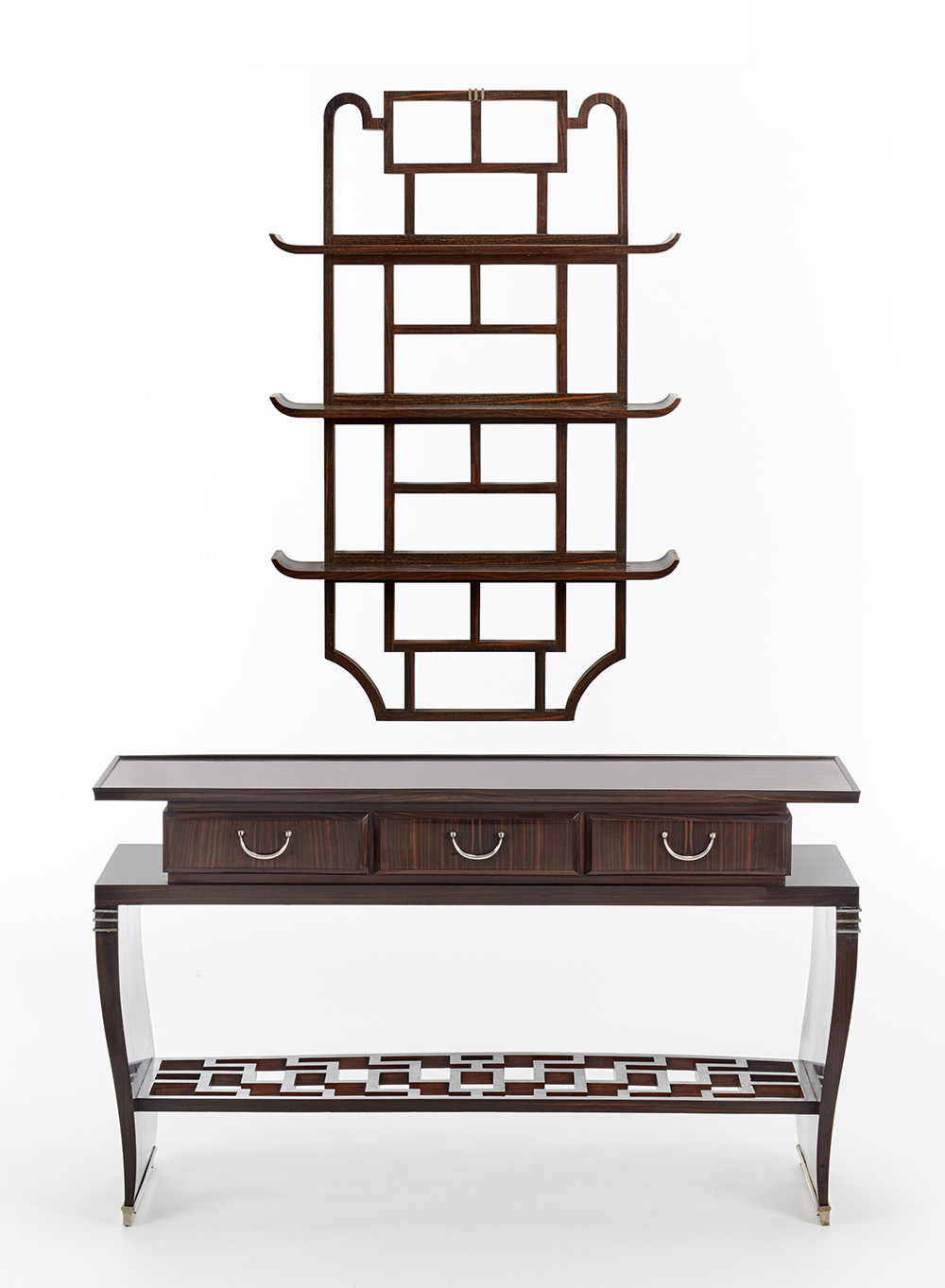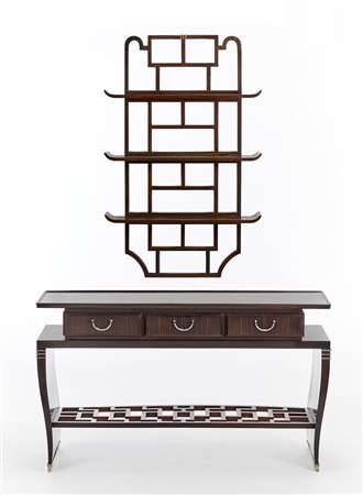 Consolle a tre cassetti con peltriera nello stile di Paolo Buffa in legno di palissandro indiano impiallacciato e bordato, puntali e listelli in ottone argentato. Italia, anni '30. (consolle: cm 135,5x79x40; peltriera: cm 80x125x12) (lievi difetti)