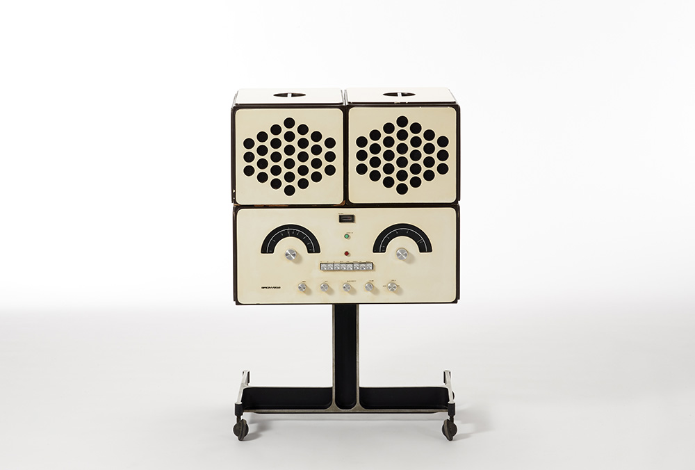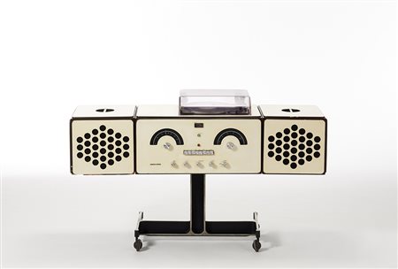 Radiofonografo modello "RR126". Produzione Brionvega, Italia, anni '70. Scocca in legno laccato bianco, casse modulari asportabili, sostegno a rotelle in alluminio pressofuso anodizzato. (chiuso: cm 61x92x37; aperto: cm 122x65x37) (difetti)
