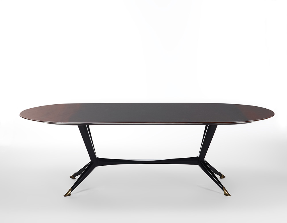 Grande tavolo in legno dipinto rivestito in resina, gambe in legno tinto nero con puntali in fusione di ottone. Italia, esecuzione recente. (cm 250x76x115,5) (lievi difetti)