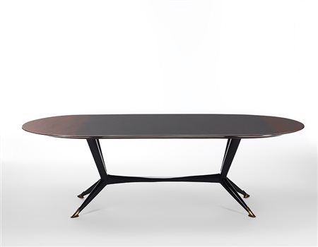 Large table in painted wood covered in resin, legs in black-stained wood with cast brass tips. Italy, recent execution. (250x76x115.5 cm.) (slight defects)
