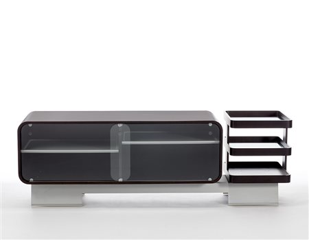 * Mobile contenitore modello "On line". Produzione Giorgetti, Milano, 2002. Multistrato lineare e curvato con basamento curvato e distanziali in alluminio anodizzato, finitura in wengè lucidato. (cm 190x68x55) (lievi difetti)