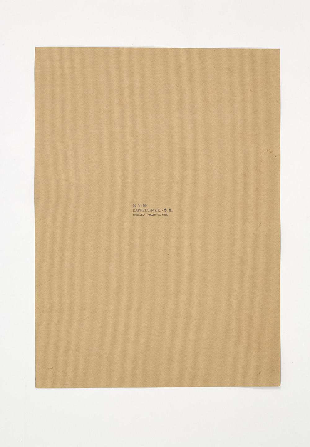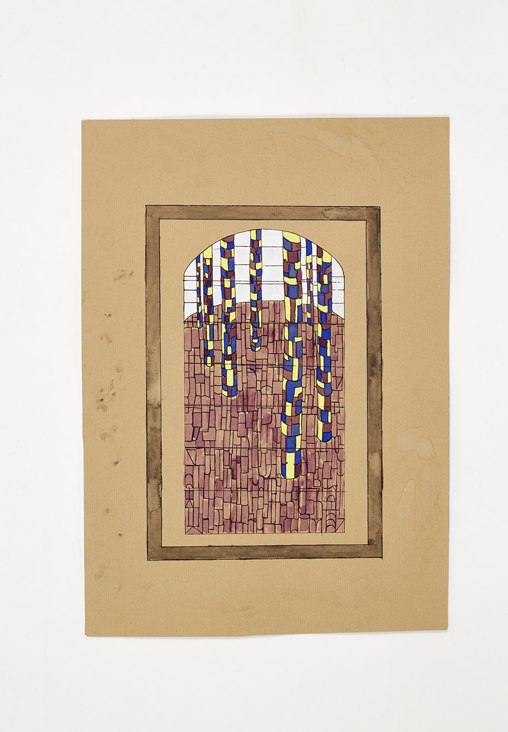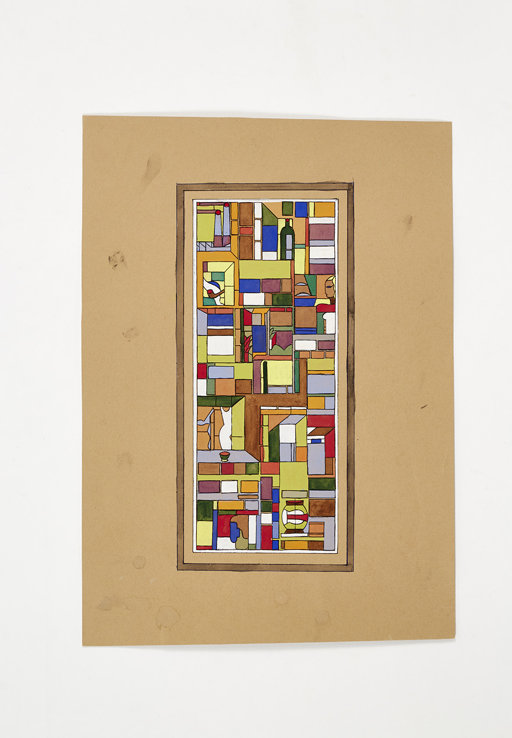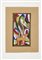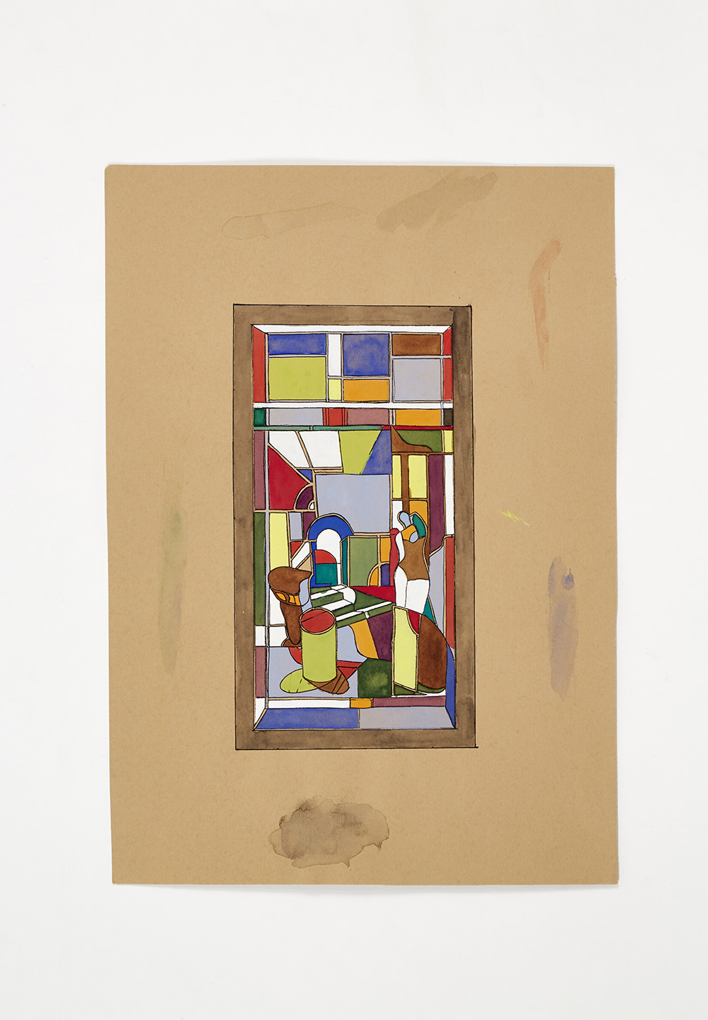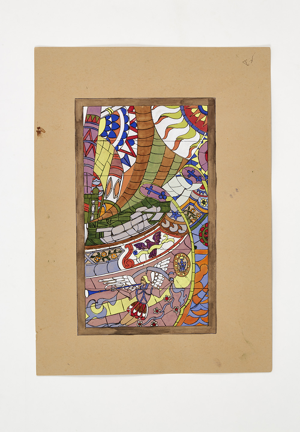 Sketch "The sculpture" made to a design by Mario Romano for the exterior glazing of the Rome Quadrennial building of 1931; (41.8x29.6 cm) ".. Watercolor, white tempera and black china ink on paper. Bearing stamp "MVM CAPPELLIN and C.S.A. MURANO - Palazzo da Mura" on the verso. (slight defects)