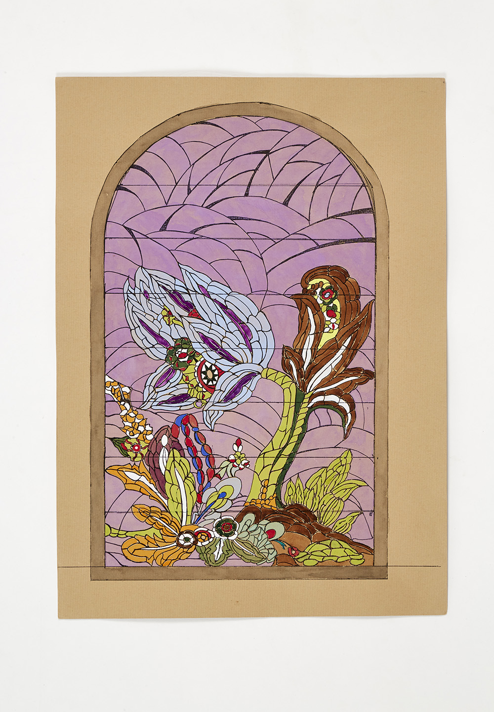 Bozzetto con soggetto floreale realizzato su disegno attribuibile a Thayaht per la vetrata allestita nel negozio MVM Cappellin di Firenze tra il 1927 e il 1928 circa; (cm 41,8x29,6)