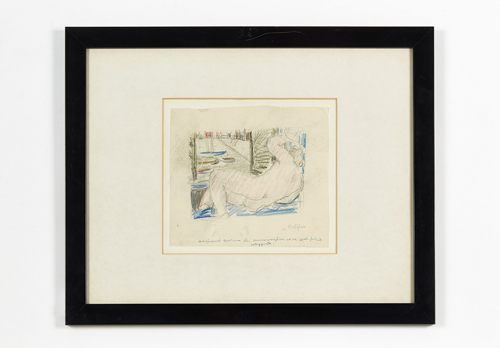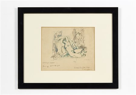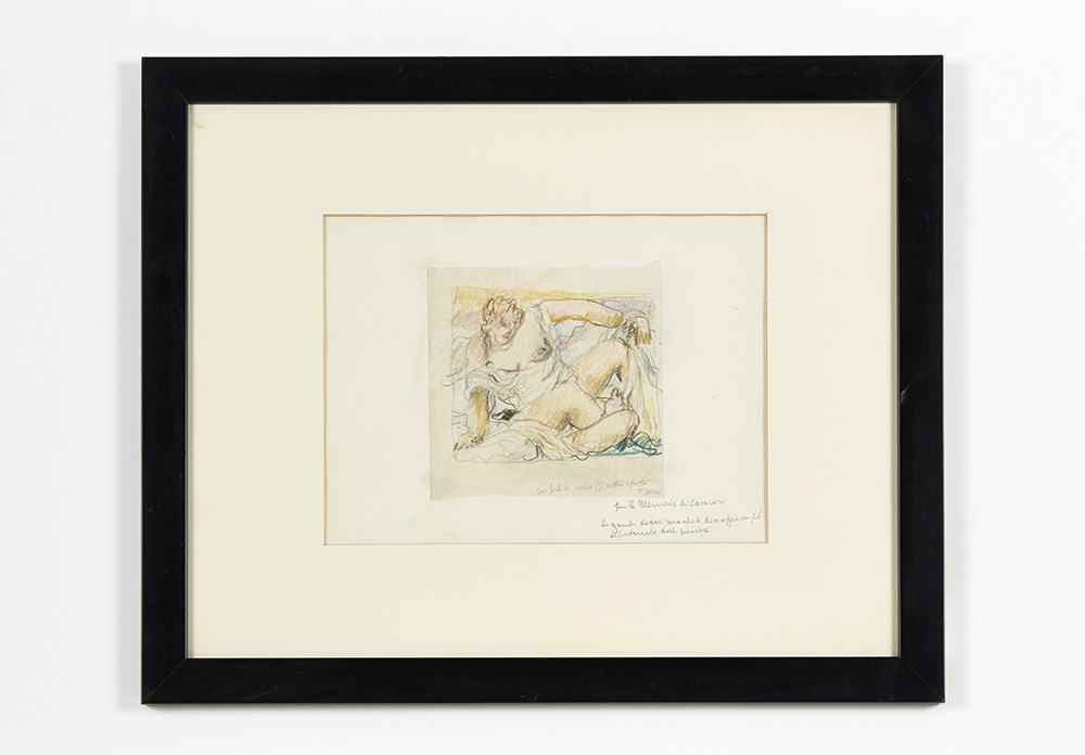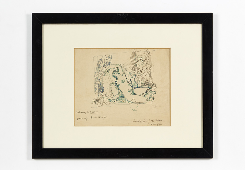 Lot of four different subject and setting drawings with handwritten notes. Mixed techniques on paper. Three drawings bear the signature "T. Buzzi" in the lower right corner (cm 15x15; cm 20.5x16; cm 19x21.5; cm 22x27). In frames with passepartout.. (slight defects)